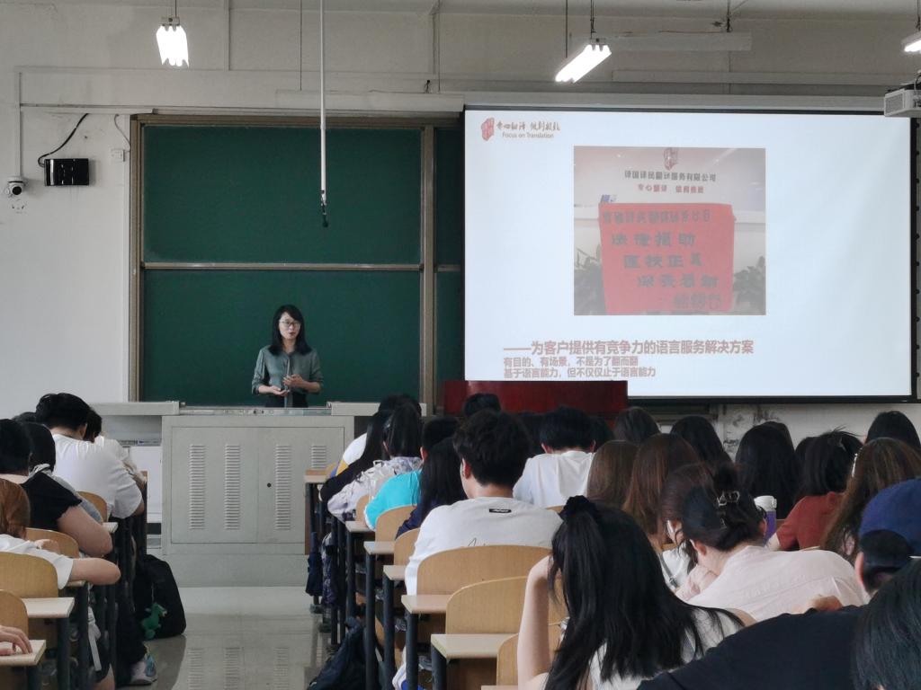 雷良琼对该集团公司的基本情况做了简要介绍,围绕翻译行业现状、行业性质与特点进行了全面讲解,以全球语言服务行业发展趋势图为例,对全球语言服务进行分析,讲述了从翻译到语言翻译职业规划与就业的变革。她强调,学生应熟练掌握全球主流机器翻译平台的使用,她以自身多年翻译实践经验为学生提供了宝贵的关于专业学习与职业规划的建议。
