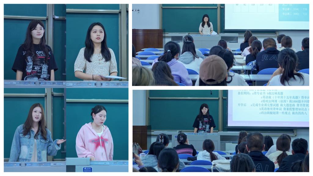 的赫雅婷以及江苏师范大学的张晏梓四位同学主讲,旨在通过2024届已录取高分学生的亲身经历和宝贵建议,激励和帮助更多学子高效备考。2021级辅导员张馨元及百余名计划考研学生参加会议。