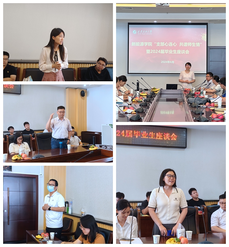 发展建言献策,言语间饱含着对老师、对同学的感激和眷念。各系主任和专任教师纷纷对同学们送上祝福,希望每一位毕业生能够坚定理想信念,练就过硬本领,把握时代机遇,做到眼中有光、脚下有路、心里有劲,在青春赛道上奋勇奔跑,与伟大时代“双向奔赴”,彰显出新能源学子的责任与担当。在座谈会的尾声,有的支部齐唱《常回家看看》,有的支部为毕业学子准备了毕业蛋糕,教师代表和学生代表共同完成毕业蛋糕的“第一切”。融洽的互动氛围寄托着全体老师对同学们的殷切期望和深切祝福,四年的青春虽已落幕,但属于2024届毕业生们的崭新未来,也由此揭开序幕。
