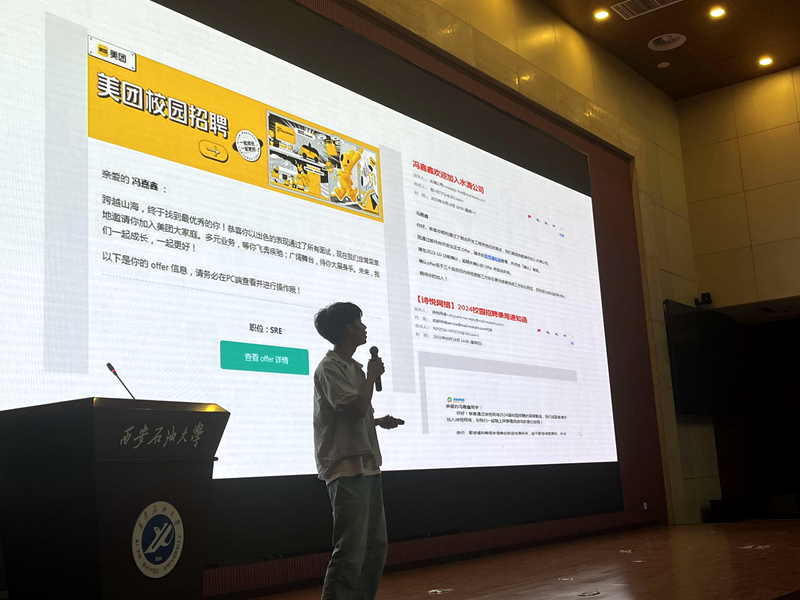讲座伊始,高博首先为同学们分享了当前计算机就业市场的趋势和变化,强调了技能培养的重要性以及如何通过实习和项目经验增强自身竞争力。随后介绍了2024届秋招以及春招的相关情况,通过强调校招呈现出的招聘需求减少、招聘节奏缓慢和求职人数下降的现实,提醒同学们不可盲目乐观,要树立理性平实的就业观念。此外,高博还分析了IT行业的自身优势,解析IT大厂的招聘要点,从笔试、面试、实习等环节列举应聘者的优秀素养,强调不断提高个人核心竞争力尤为关键。最后,高博希望同学们立足实际,找准定位,保持旺盛的学习精力,不断提升学习能力,以良好的精神面貌迎接个人发展中的各种挑战。
