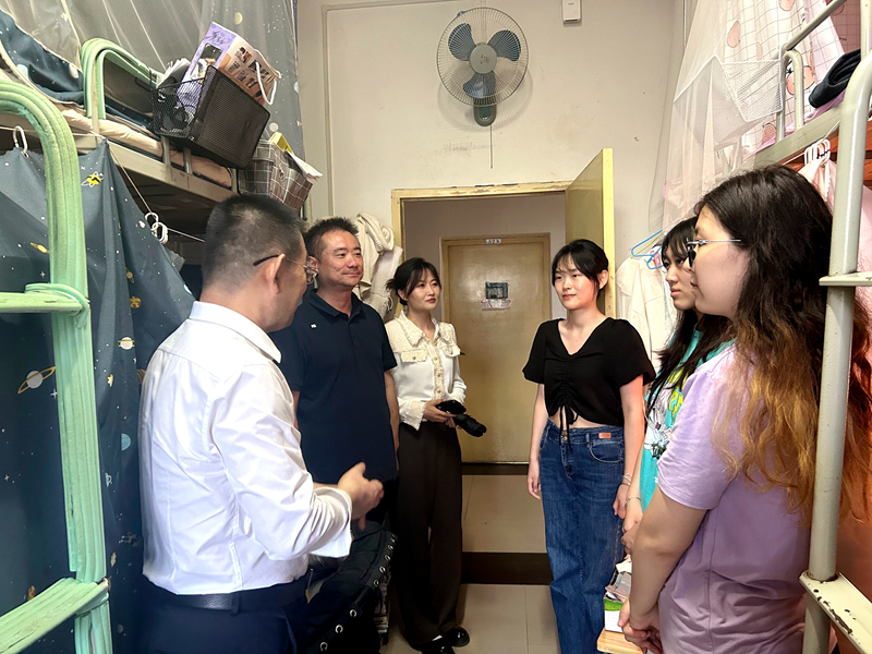 党委书记庞秉谦、党委副书记庞远、学工办主任乔晓、2024届本科生辅导员刘亭普深入宿舍与学生话别。