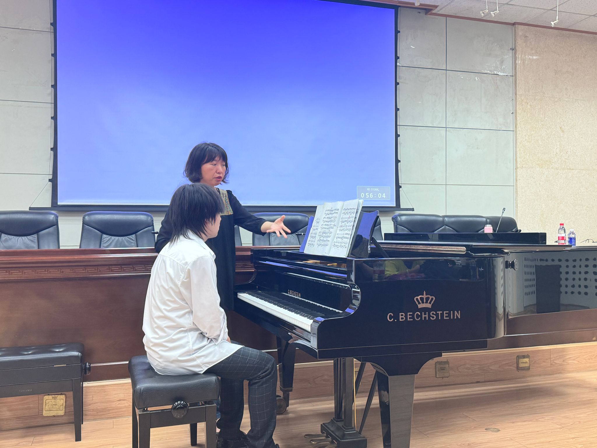 钢琴学术讲座的后半段是钢琴教学实践活动。第一位龚海军同学演奏的是拉赫玛尼诺夫《音乐瞬间》,刘玉茹老师用丰富的教学经验细致的给讲解了乐句的旋律特点,节奏变化 ,每一个细节都被反复强调和练习,指导如何在钢琴上准确地诠释出拉赫玛尼诺夫独特的音乐风格。第二位同学袁馨怡演奏的是《新疆随想回旋曲》,刘老师针对曲子中的高难度段落进行了细致入微的分析和示范,从快速的音阶跑动到复杂的节奏把握,再到双手的协调配合,每一个细节都被精准的拆解和演示。手把手的指导学生如何弹出作品的音乐风格。