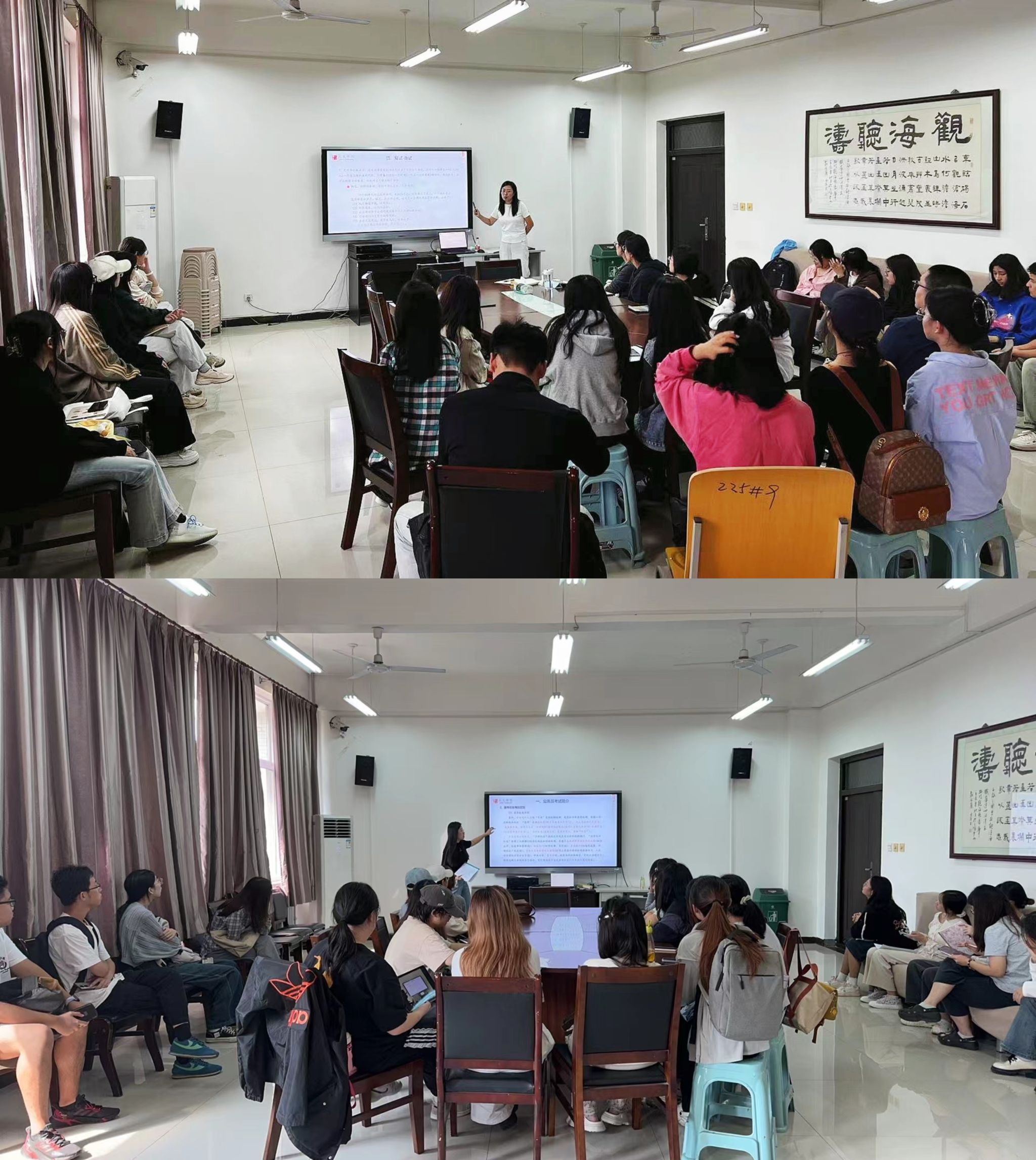 于9月25日、10月8日分两场为2022级52名为有意向参加公考的学生举办公务员备考答疑座谈会,由学工办主任付强主讲,辅导员范嘉欣主持。