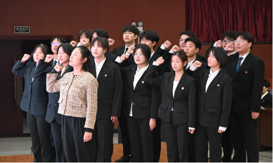 团委书记王璟带领新任团委委员、新一届学生委员会委员面向国旗庄严宣誓就职。新任委员代表刘丹阳作工作展望。