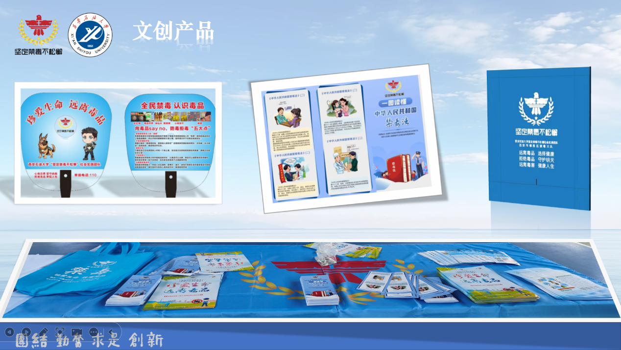 实践活动开始前,为了扩大禁毒宣传效果,团队成员创作了6幅禁毒宣传海报,设计了印有禁毒知识的扇子,漫画三折页以及环保手提袋等文创产品。