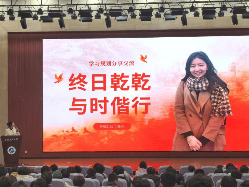 王雅婷同学以“终日乾乾,与时偕行”为题,围绕合理规划、成长建议和个人寄语三个方面,着重强调了学习过程中的“自知”、“自律”、“做自己”以及“勇于探索、尝试和体验”的重要性。她建议同学们在学习过程中要注意劳逸结合,合理安排时间,同时鼓励大家要倾听内心的声音,积极参与各类活动,做有意义的事情;要真诚地爱自己,勇敢地追逐个人梦想。