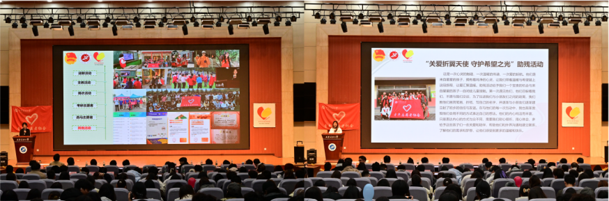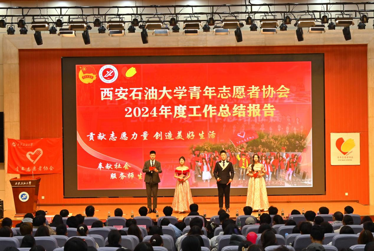 青年志愿者协会2024年工作总结报告会在鄠邑校区弘石学术报告厅举办,青年志愿者协会指导老师王泽文、青年志愿者协会全体成员、团委各中心代表及各学生社团共计600余人参加。