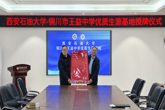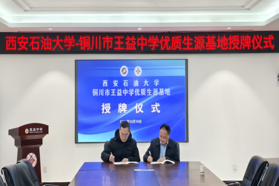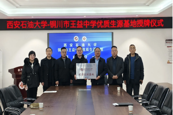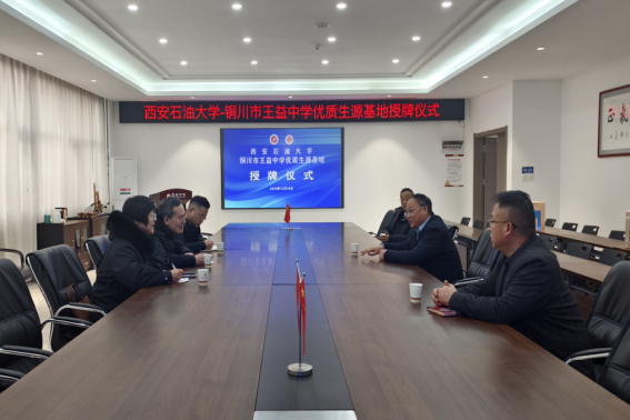 党委书记张建高一行3人前往铜川王益中学举行“优秀生源基地”签约授牌仪式。铜川王益中学党委副书记、校长张新奇、副校长杨小刚、副校长张向伟、教育处主任史民老师参加了仪式。