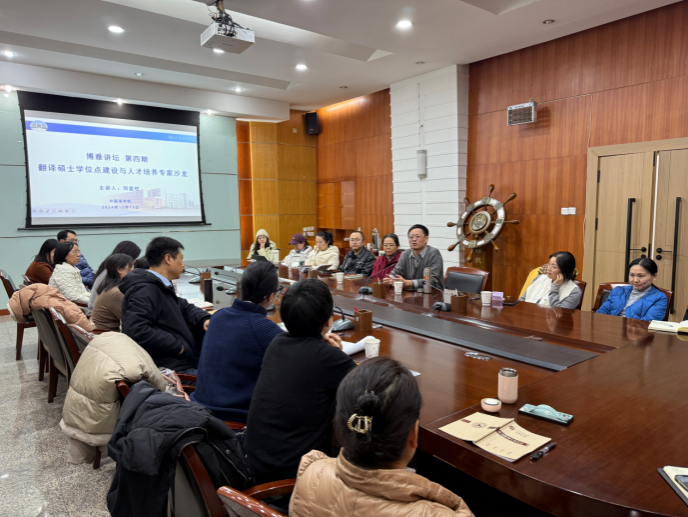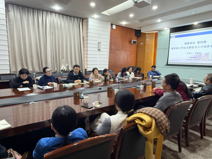 研究生导师与司显柱教授进行了热烈的讨论。董梅和陈柯分别就英汉笔译课程中的教学方法和人文学科如何解释案例的经济价值过程中遇到的问题进行广泛讨论。最后,陈武对俄语笔译专业方向的申报进行提问交流。