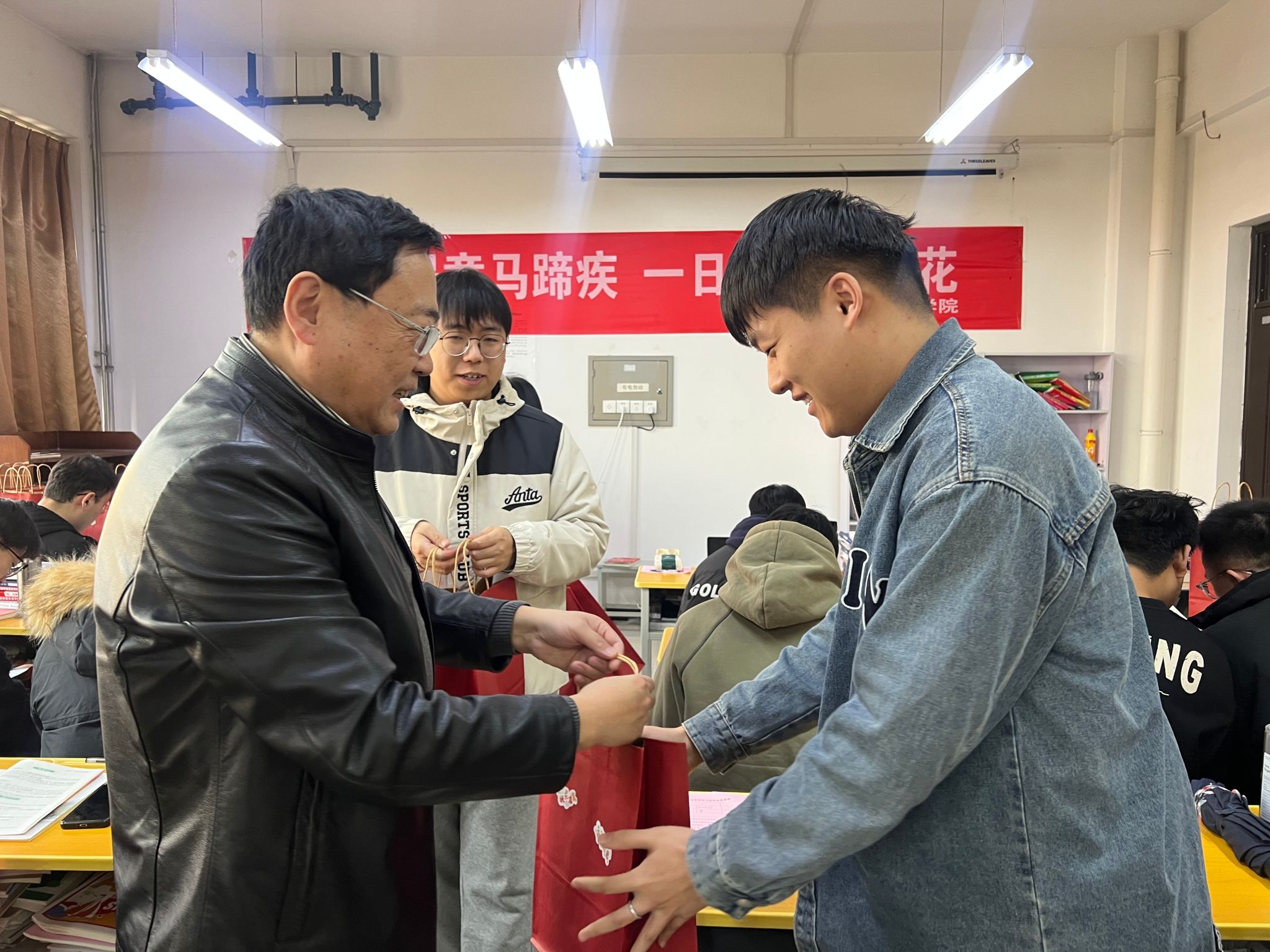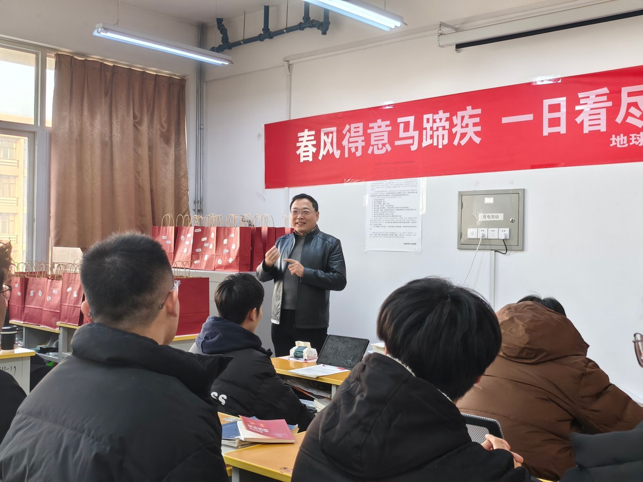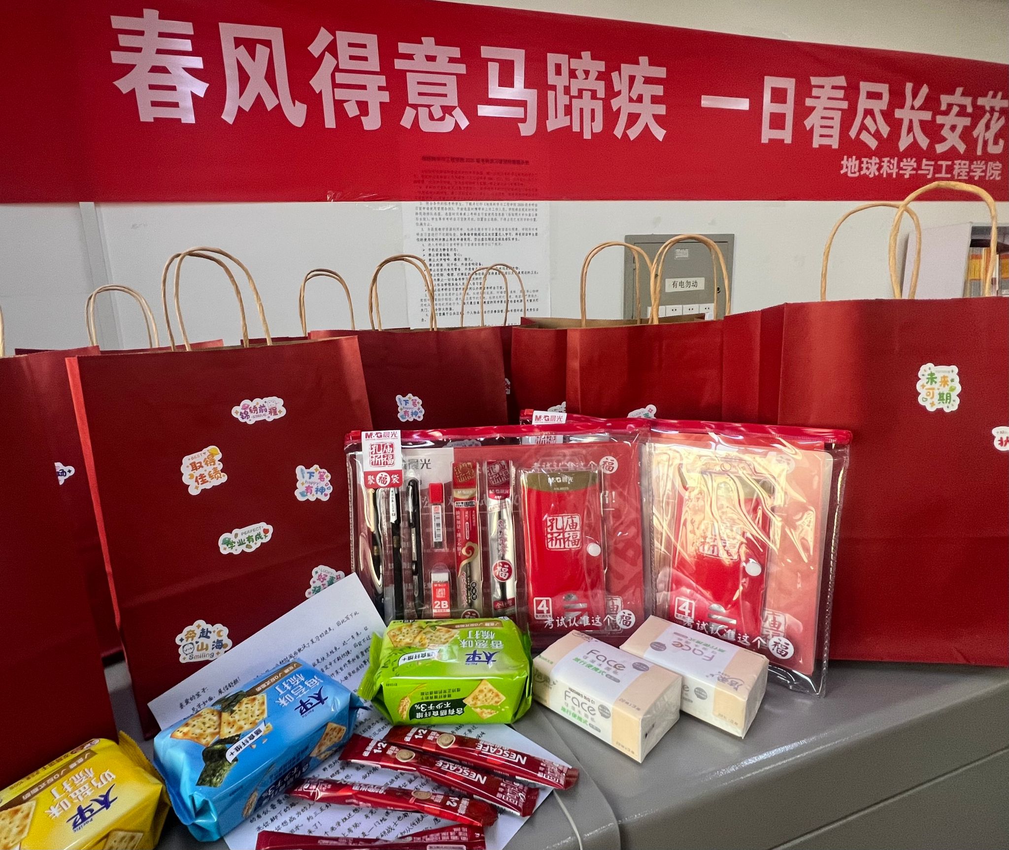 党委书记马行天、2021级辅导员李佩琦于2024年12月16日携暖心考研大礼包走访考研自习室,慰问考研学子。
