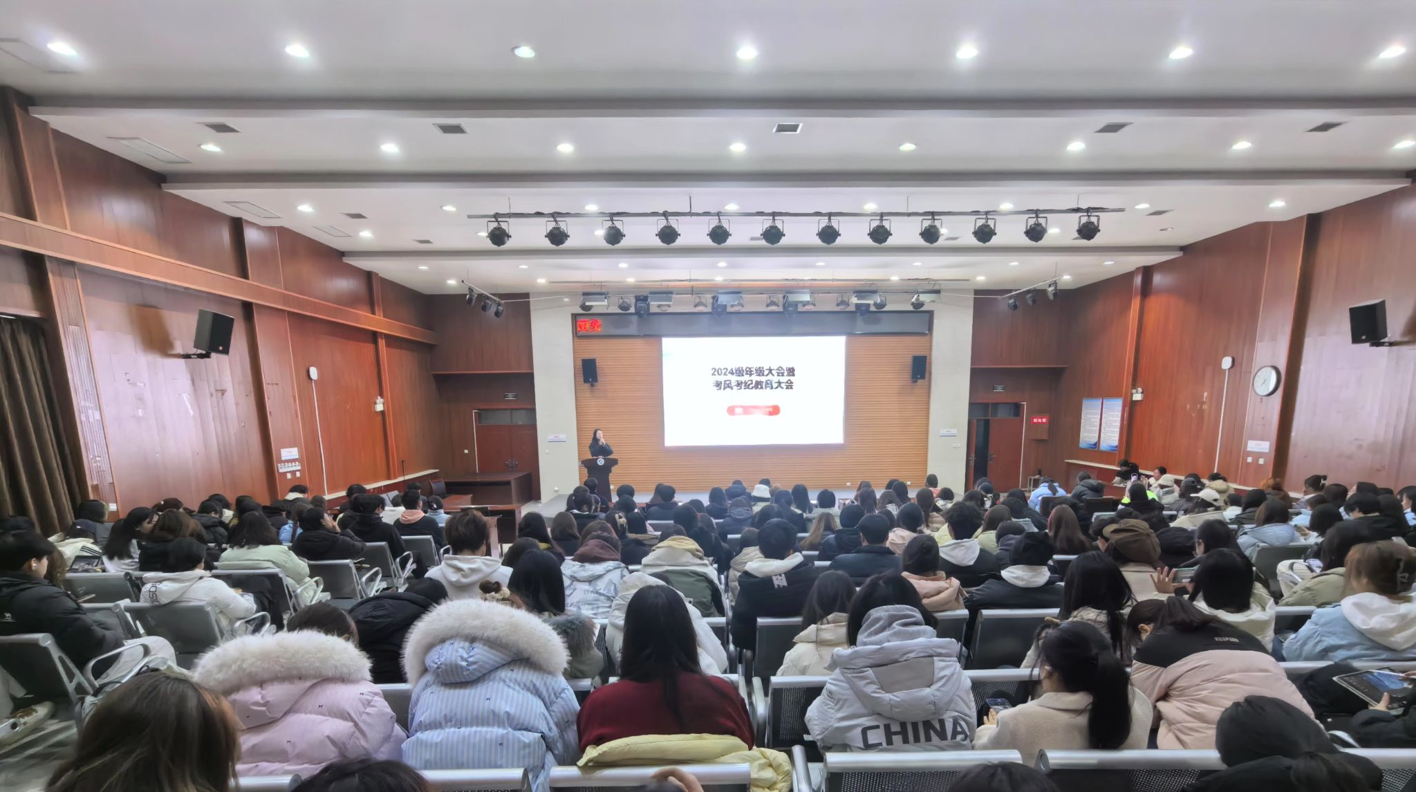 于12月25日晚在崇文楼118室召开了2024级年级大会暨考风考纪教育大会,会议由2024级辅导员樊煜主持,2024级全体学生参加。