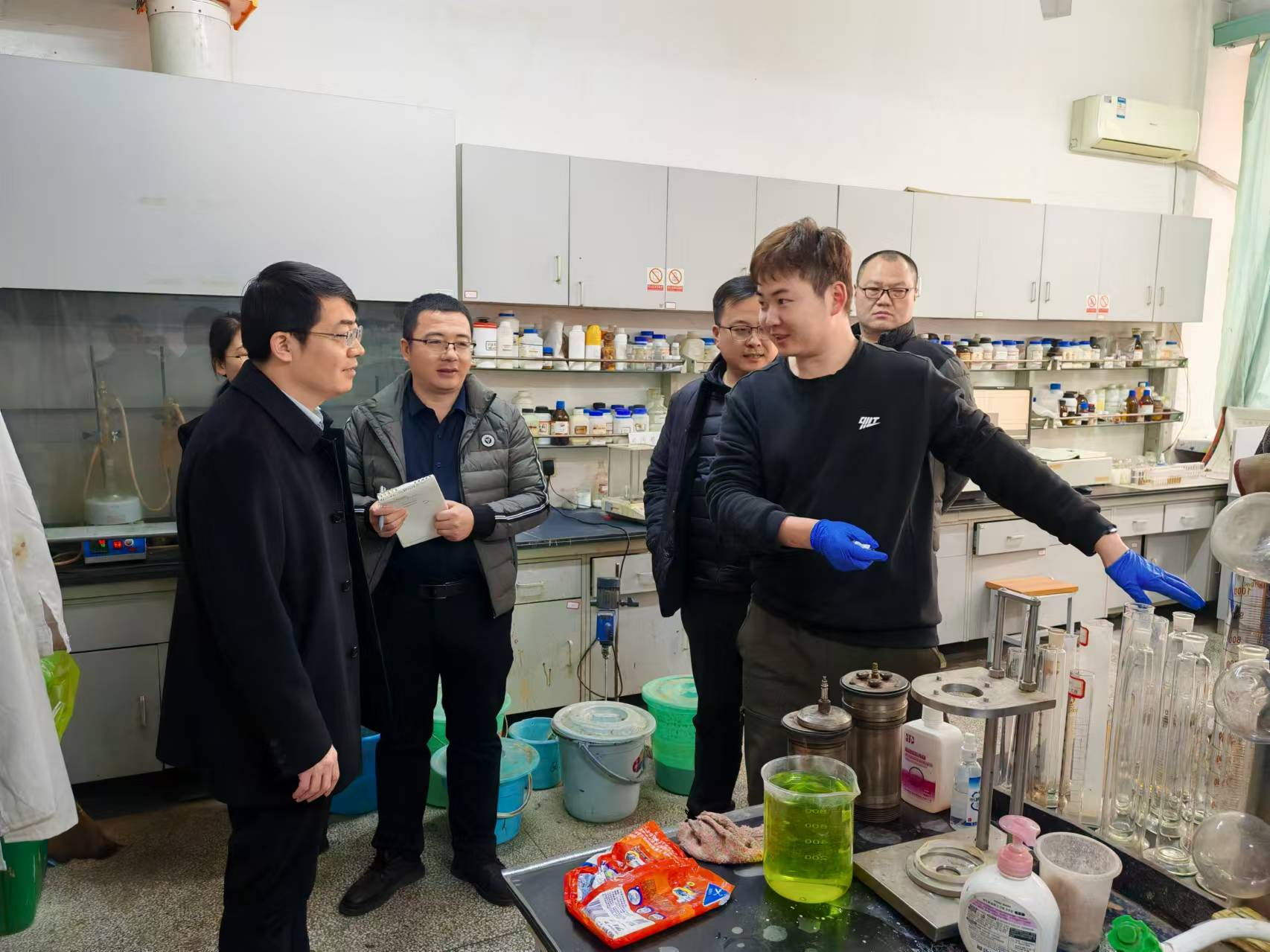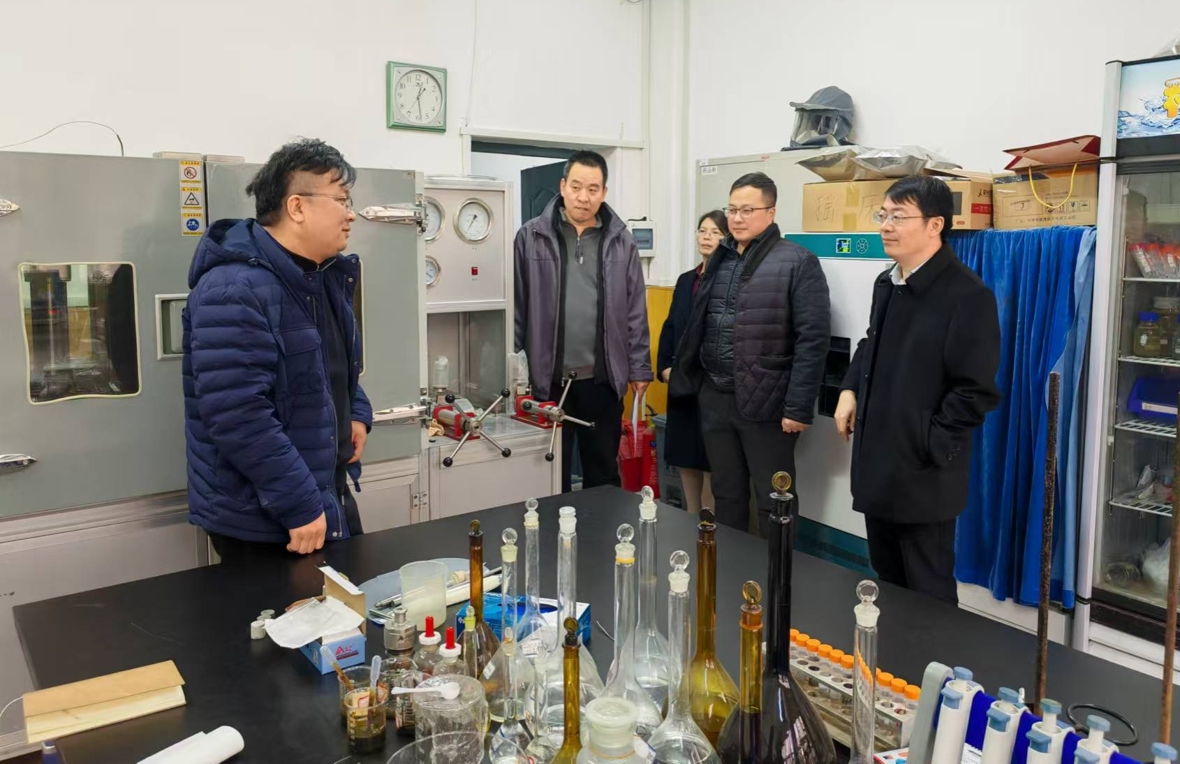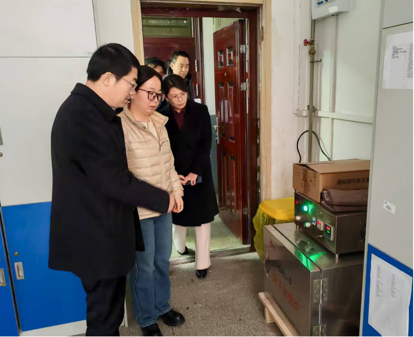 检查中,对假期仍继续开放使用的实验室进行了备案检查,明确相关安全负责人,遵循“谁主管、谁负责”、“谁使用、谁负责”的原则,对做实验的学生进行安全宣传教育,以确保实验室的安全运行。高小明在实验室和学生亲切交谈询问实验开展情况,并强调放假期间必须关闭所有不使用设备的供电,做好实验室供水设施的安防工作,预防跑水、冒水、漏水等事故的发生。检查过程中,检查组对各实验室环境卫生、化学品安全、特种设备安全、规范用电、消防安全管理情况进行了重点检查。