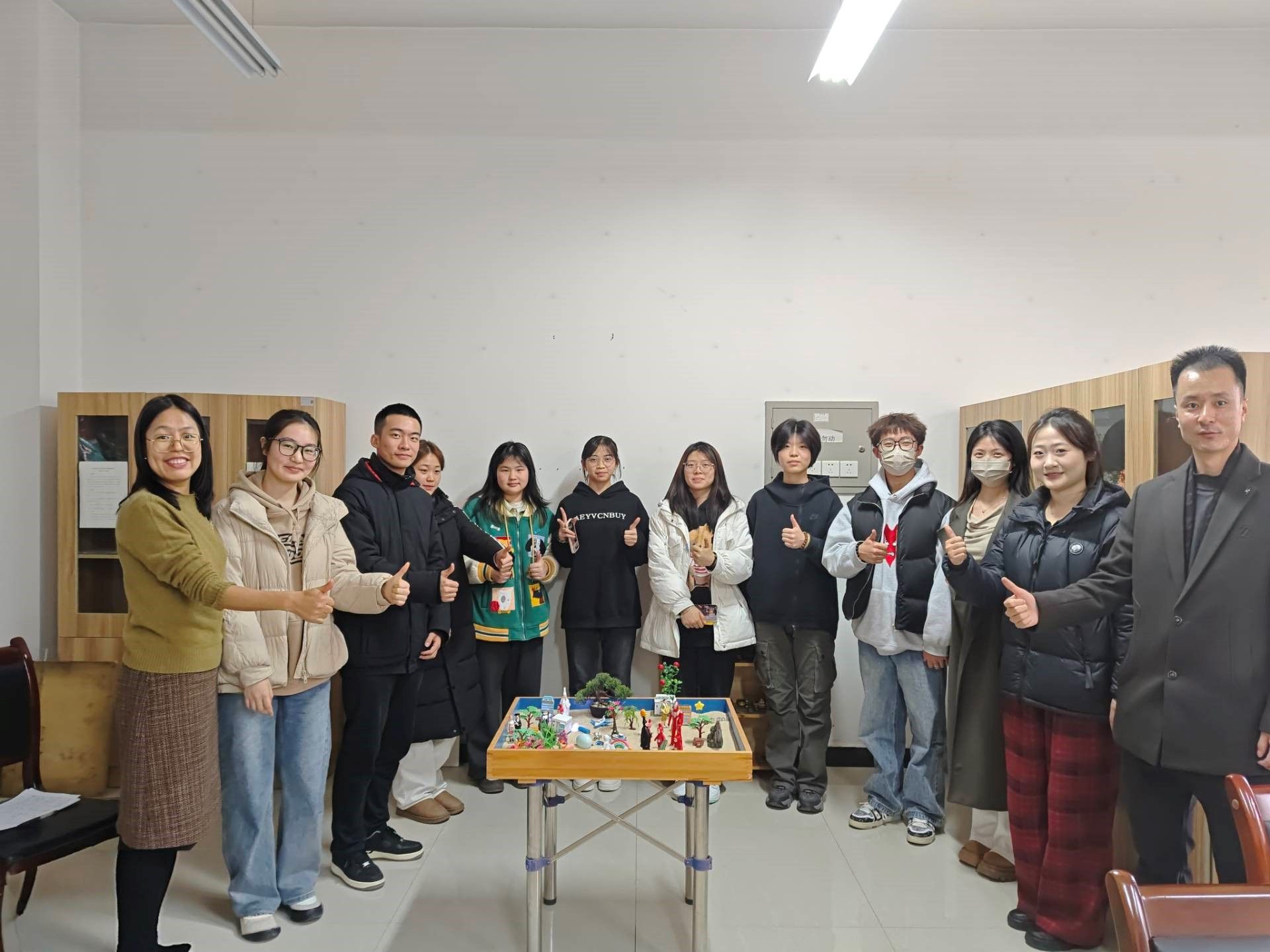活动分为理论知识讲解和沙盘布置两个环节。魏老师首先围绕沙盘辅导概述、规则和团体沙盘辅导如何构建和谐的人际关系开展讲述,重点讲解了如何组织沙盘团体辅导,包括团体成员的选择、创建团体沙盘及讨论与分享等。在沙盘布置环节,同学们按照顺序依次选择摆放,逐步完成了团队的沙盘作品。随后,每位同学都对自己的摆放过程进行了分享,讨论作品名称。