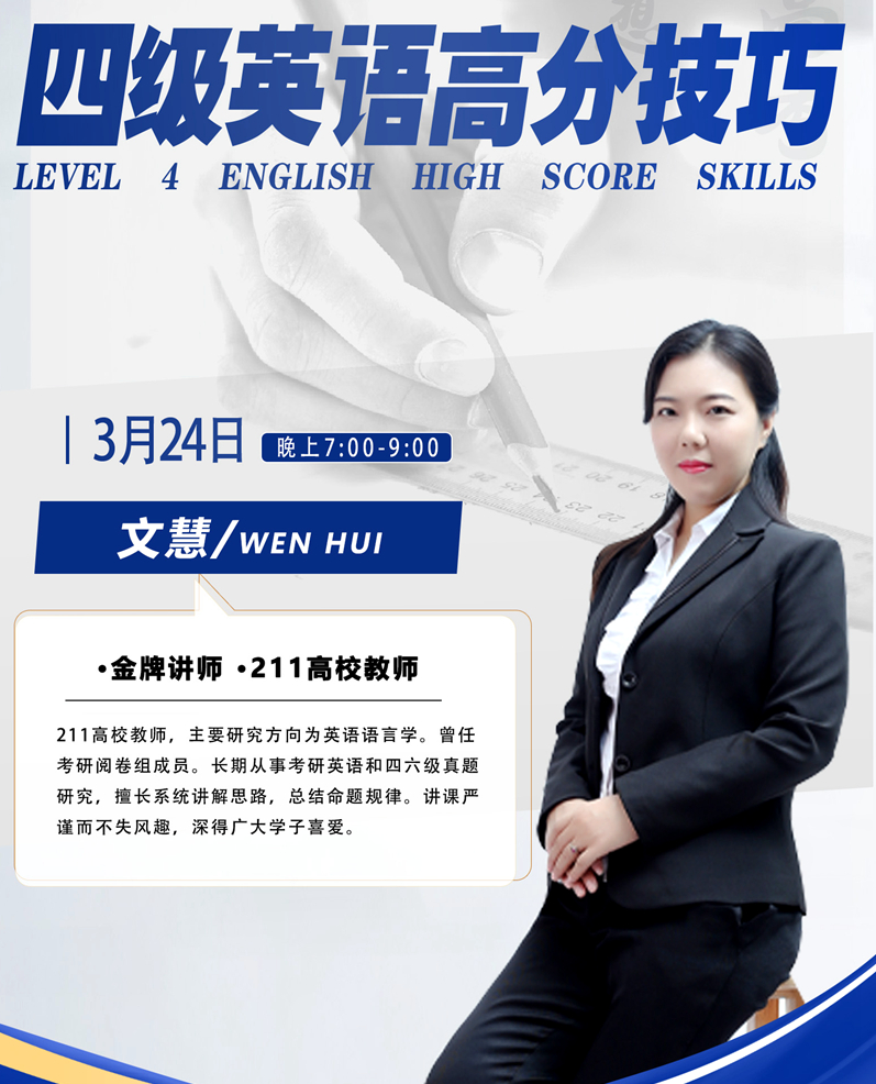 在鄠邑校区博览楼B101室举办了全国大学英语四级考试辅导讲座。此次讲座邀请从事四级真题研究的资深老师文慧主讲,德州扑克