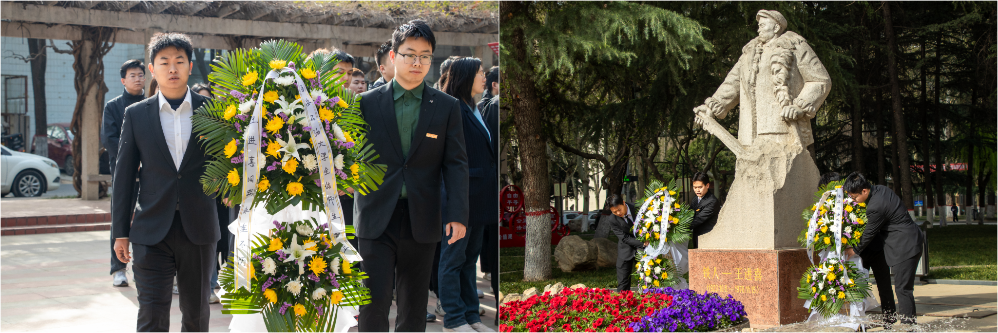 晨光中,铁人塑像巍峨矗立,寄托着无尽追思。研究生代表缓步上前,将寄托着师生敬意的花篮敬献于雕像前,与会师生向铁人王进喜塑像三鞠躬,表达对铁人王进喜的缅怀和崇敬之情。
