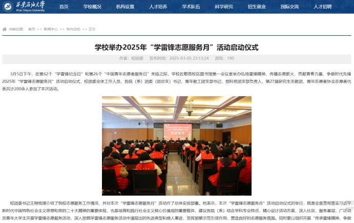 高度重视,认真组织实施,校团委积极组织动员全校广大团员青年以“弘扬雷锋精神、传播志愿薪火,贡献青春力量、争做时代先锋”为主题,开展2025年“学雷锋志愿服务月”活动。