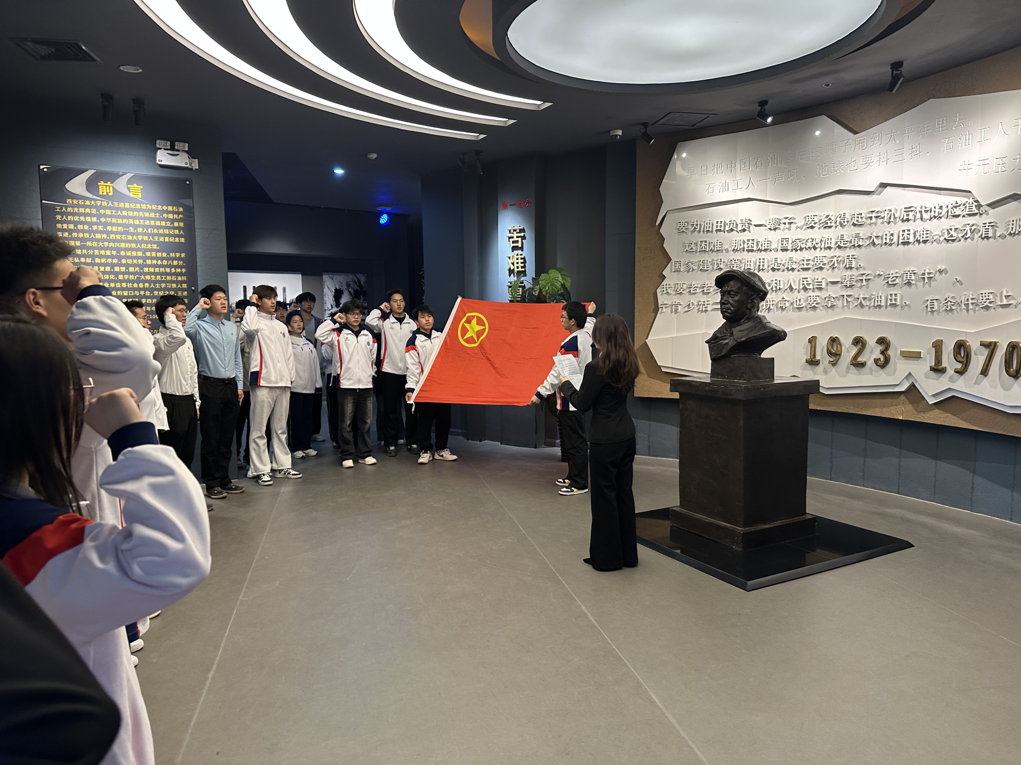 参观结束后,大家在铁人塑像前庄严列队,面向团旗重温入团誓词。铿锵有力的誓言回荡在纪念馆内,展现了青年学子传承先烈遗志、勇担时代使命的决心。
