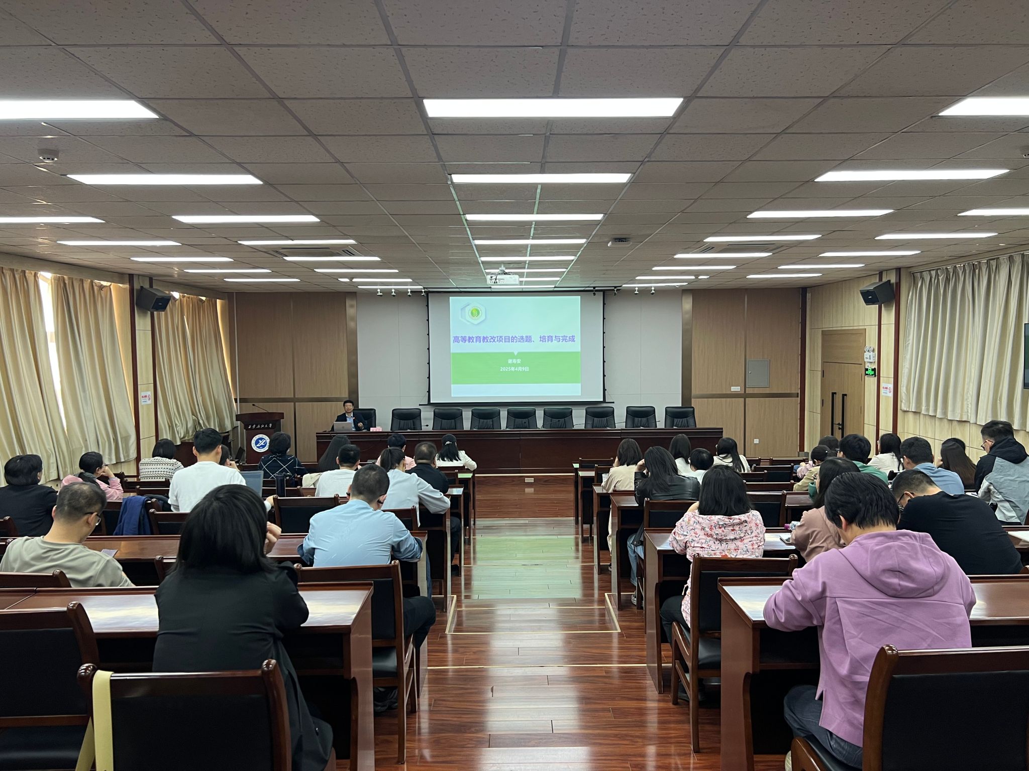 讲座过程中,谢教授点明了教改项目选题与培育选题的创新性、实用性等原则,分享了从日常教学观察中挖掘优质选题的独到方法。结合高等教育教改项目选题范例,生动展示了不同类型选题的成功路径与潜在风险。