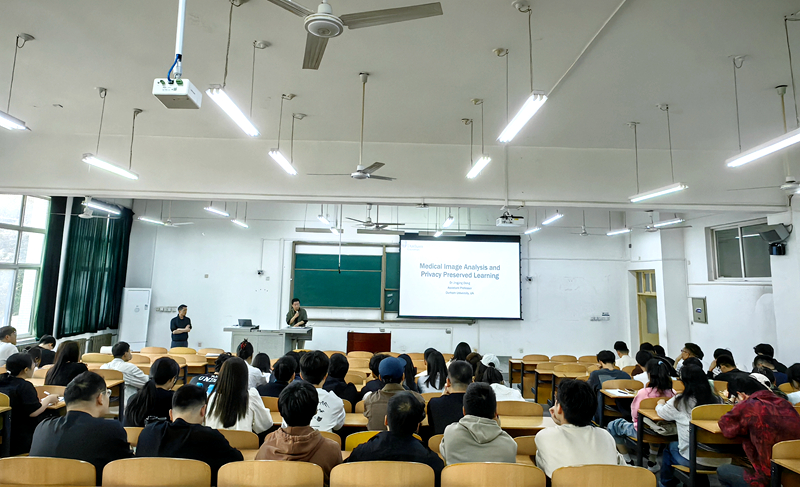 邓晶晶博士2017年于英国斯旺西大学计算机系斩获计算视觉博士学位,后入职杜伦大学计算机科学系的VIViD小组,同时联合多所高校牵头创建JLAI实验室,领导Rand2AI研究小组,致力于前沿计算模型开发,其在联邦学习的医学健康数据隐私研究领域成果突出,赢得NVIDIA、Intel、AMD等业界巨擘的青睐与支持。邓博士通过图文结合的方式,深入浅出地讲解了医学图像处理前沿技术以及隐私保护的关键要点,结合实例阐述计算机相关专业理论。讲座结尾还进行了提问互动环节,现场气氛轻松热烈。此次讲座为师生们进一步打开了思维视野,丰富了研究方向,拓宽了学术边界。