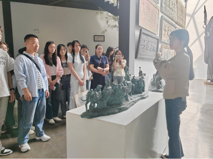 随后,大家在讲解员的引导下来到了丝路国际雕塑艺术馆。这里展示了各种形态各异的雕塑作品,每一件作品都凝聚了艺术家的心血和智慧。师生党员在欣赏雕塑艺术的同时,也感受到了多元文化交融。匾额作为中国传统文化的重要组成部分,蕴含着丰富的历史信息和文化内涵。在这里,大家亲眼见到了各种形状、大小、材质的匾额,每一块匾额都承载着一段历史故事和传统文化。在讲解员的解说下,大家对匾额的制作工艺、历史背景和文化价值有了更深入的了解。