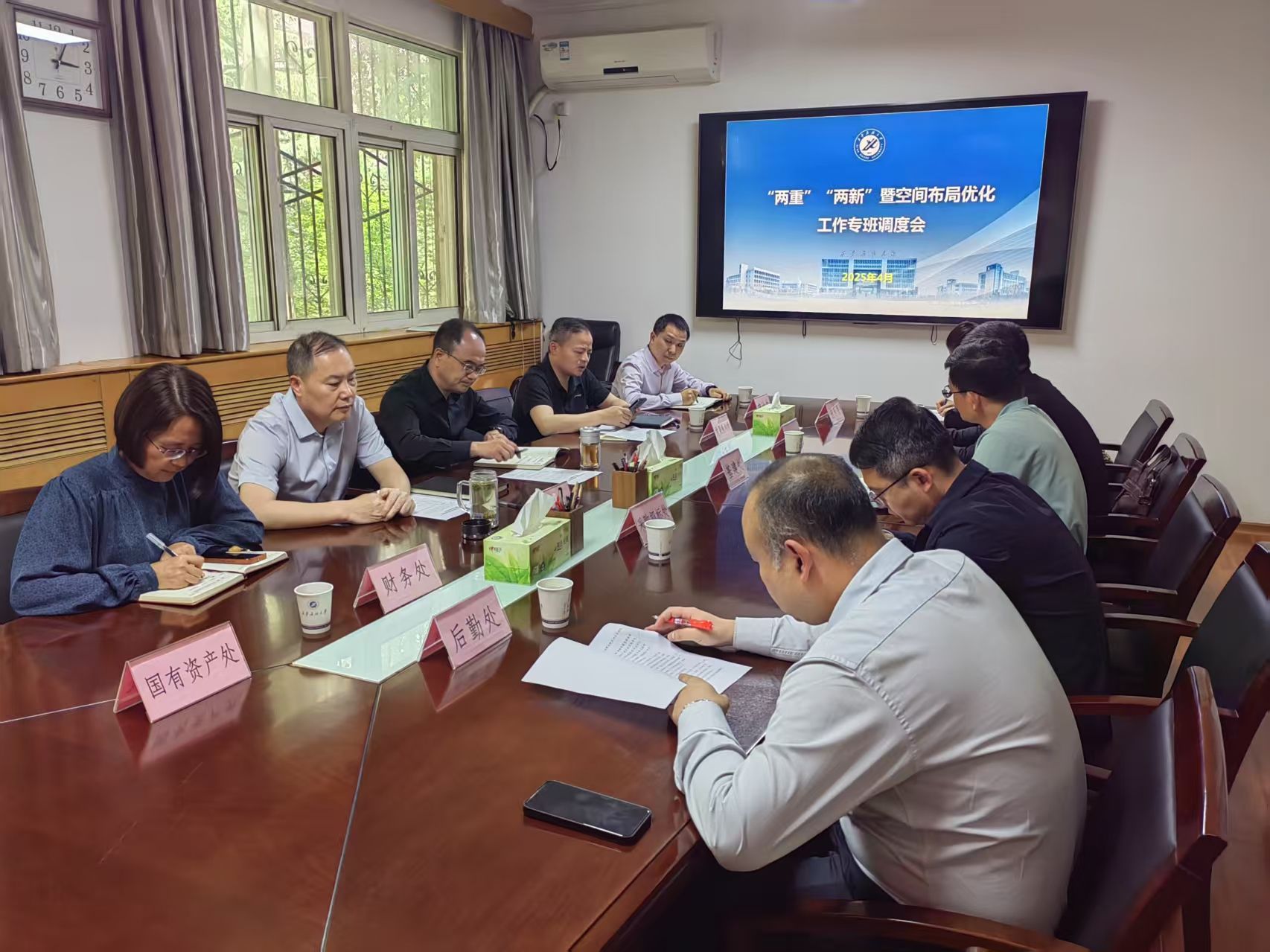 “两重”“两新”暨空间布局优化工作专班调度会,会议由“两重”“两新”暨空间布局优化工作专班副组长、副校长赵健主持。专班成员相关单位主要负责人参加会议。