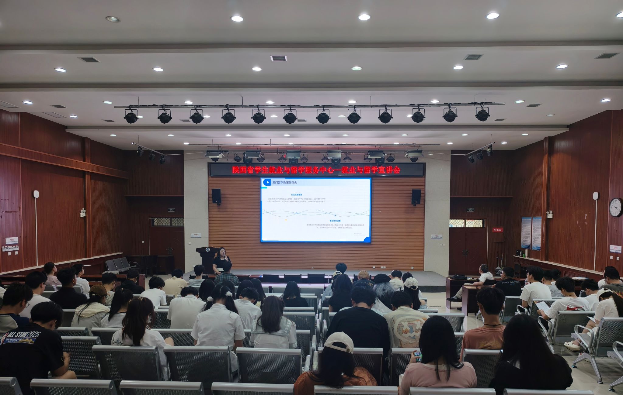 就业创业指导中心联合陕西省学生就业与留学服务中心在鄠邑校区崇文楼118报告厅举办就业留学政策宣讲会,来自全校各年级的200余名学生参加活动。
