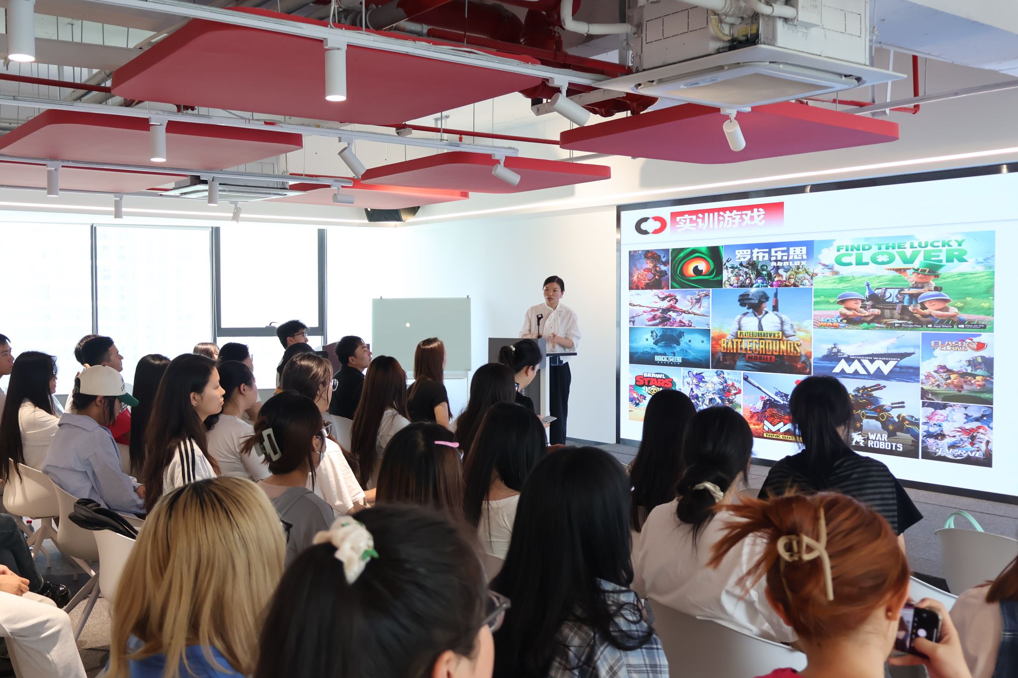栢奕集团招聘负责人曹孔首先介绍了实习生培训管理体系,并讲解了企业与多方合作开发手游的模式,展示了公司文化标识和特色办公环,带领师生实地参观游戏研发部、项目发展部等部门,了解游戏视频制作流程及工作环境。