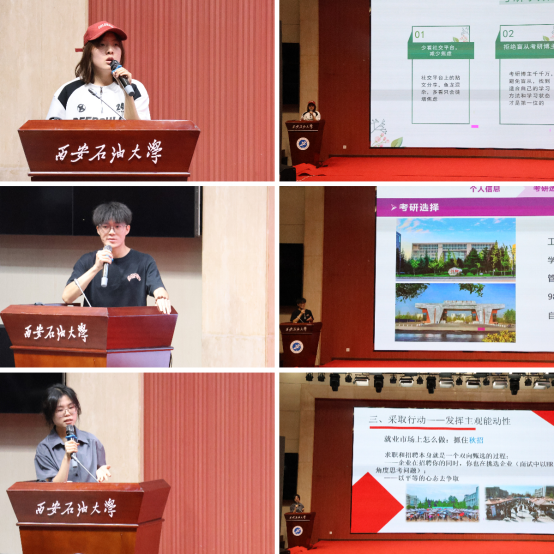 2021级优秀学生代表金倩茹、荣崇、李亚菲依次做考研、就业经验分享。他们结合自身经历,从目标确立、时间规划、复习策略、信息搜集、心态调整到简历制作、面试技巧、实习选择、offer决策等多个维度,与同学们展开分享交流,为同学们提供实战心得。