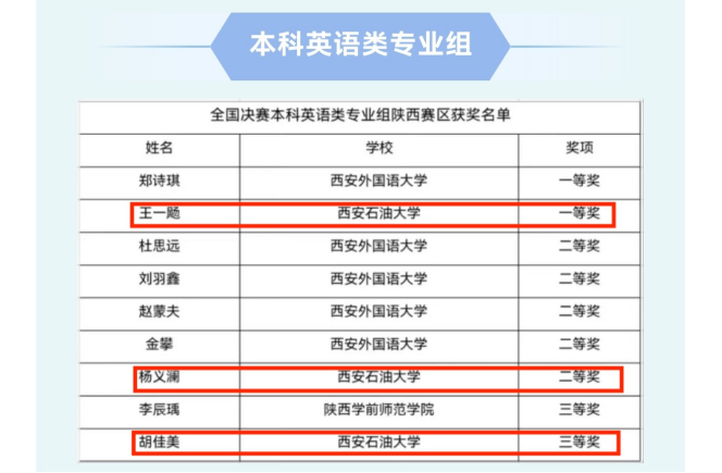 共获得省赛特等奖1人,一等奖5人,二等奖16人,三等奖20人。最终王思思、刘钰歆、李子达3位同学获得本科非英语类专业组省赛一等奖并晋级国赛;王一飏、杨义澜、胡佳美3位同学分别获得本科英语类专业组省赛特等奖和一等奖并晋级国赛。