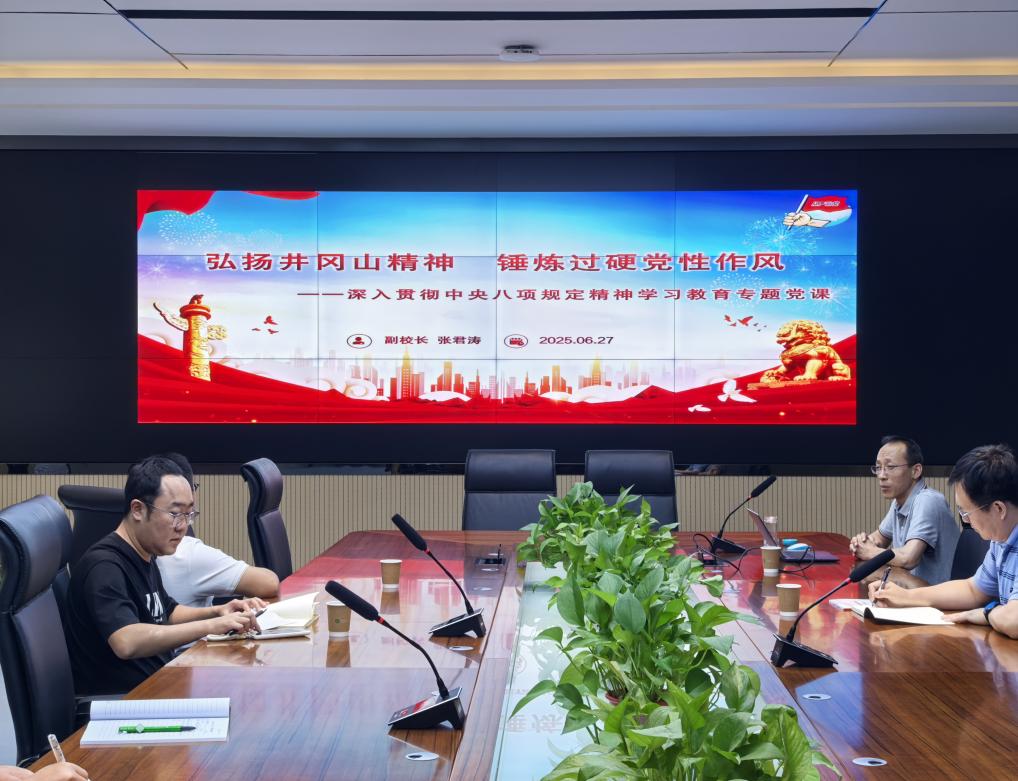 为深入贯彻落实中央八项规定精神,2025年6月27日上午,副校长张君涛以“弘扬井冈山精神,锤炼过硬党性作风”为主题,在鄠邑校区博览楼116室为教务处党支部全体党员讲授专题党课。