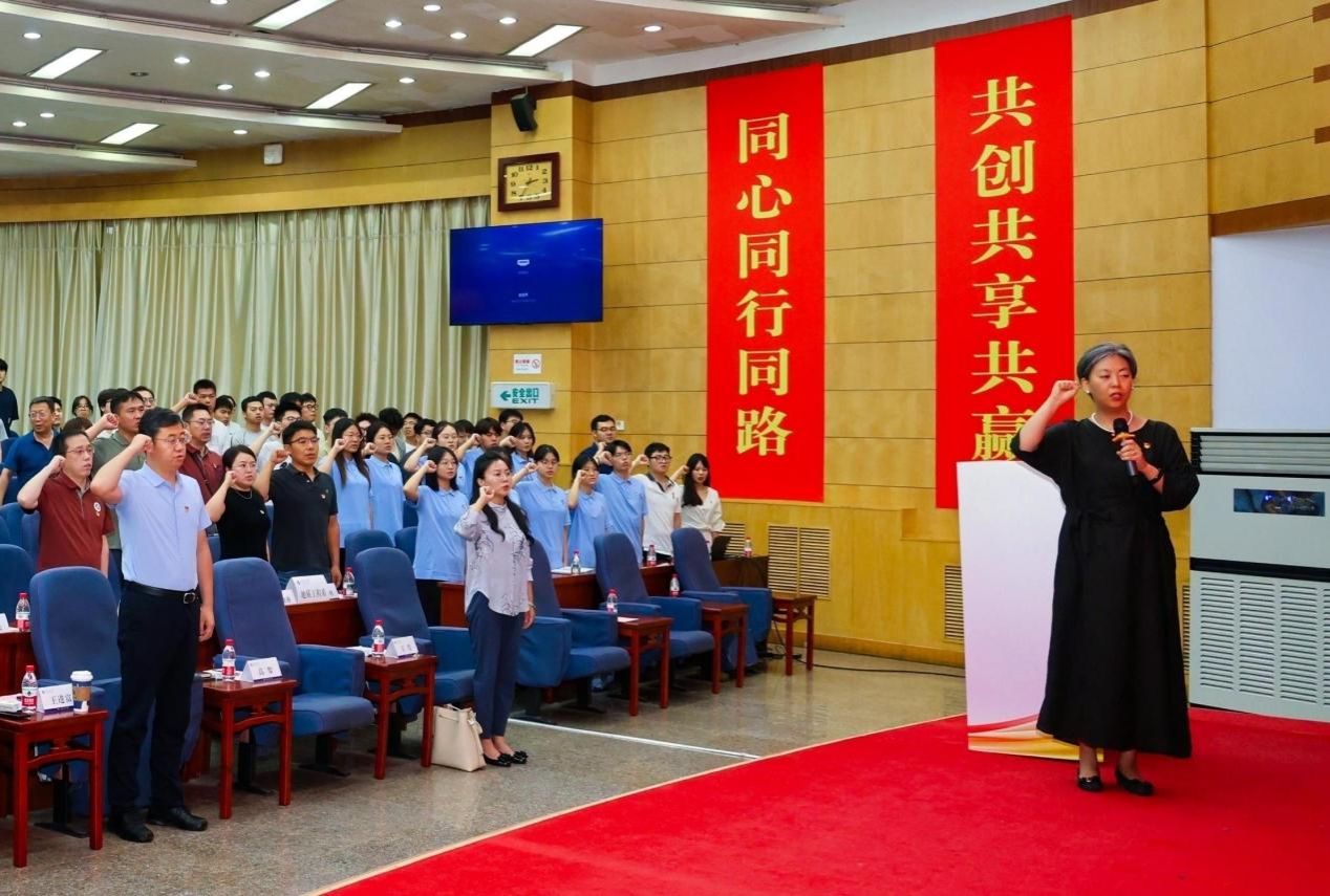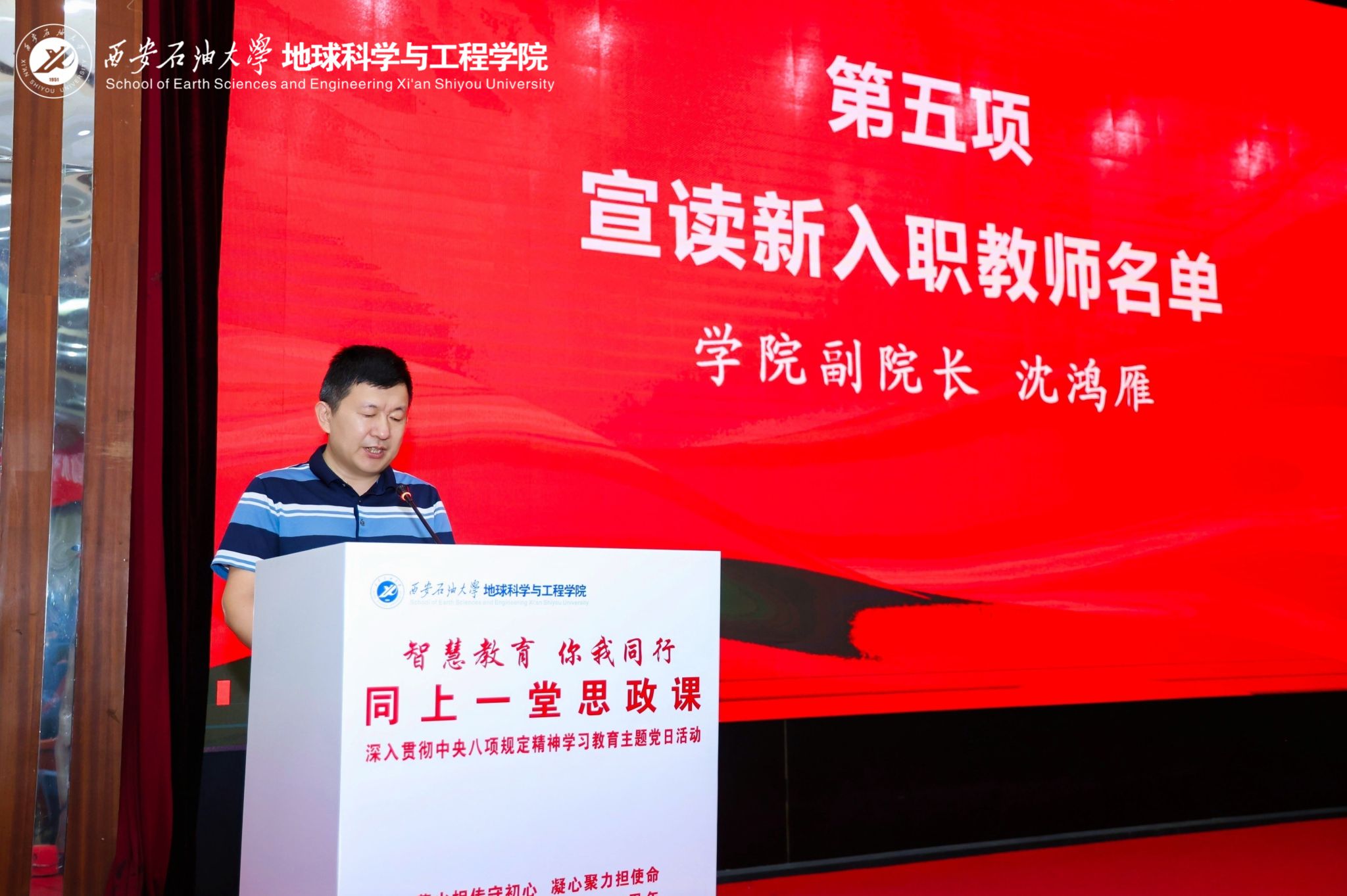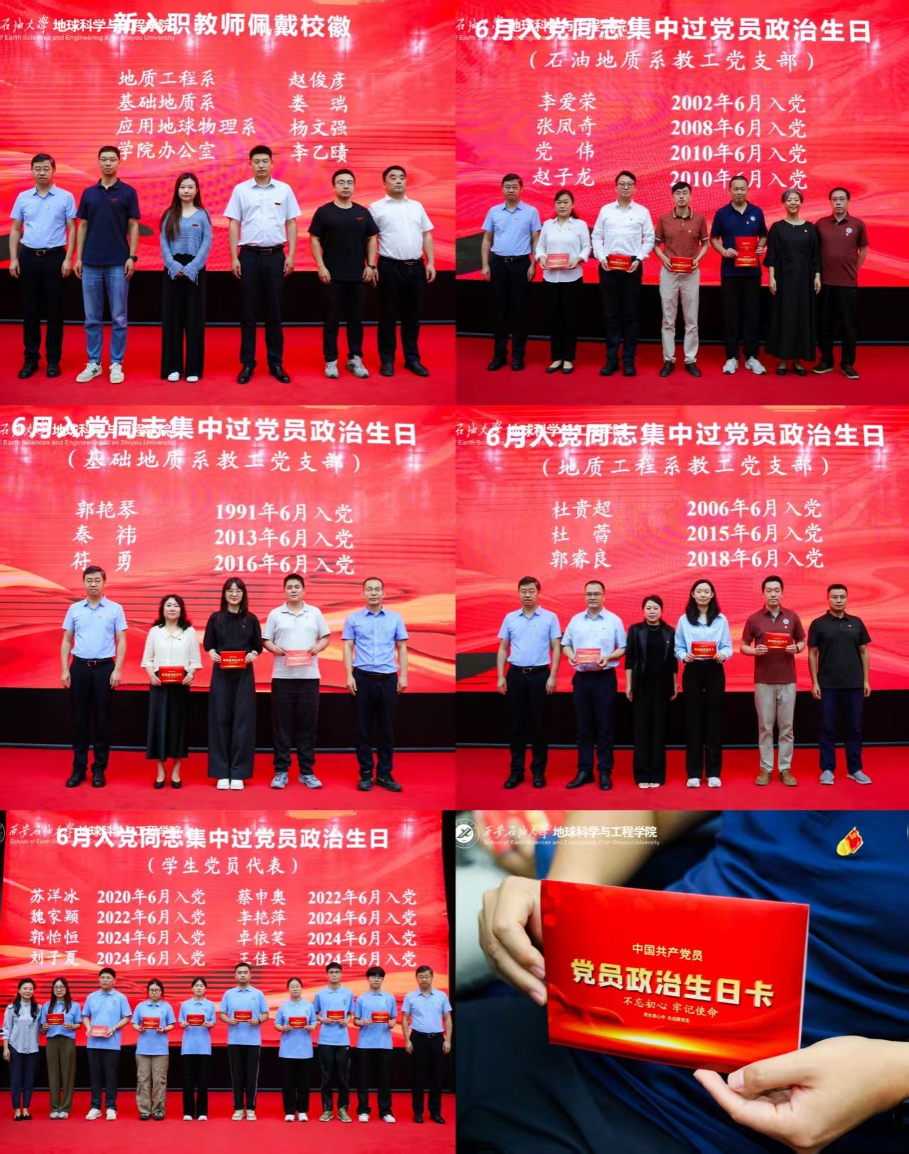 院长宋立军等与会领导为新进教师佩戴校徽,象征教育薪火相传。在集中过政治生日环节,校院领导与各系党支部书记、主任为6月入党的师生党员代表颁发党员政治生日卡,进一步强化身份认同,激发使命担当。