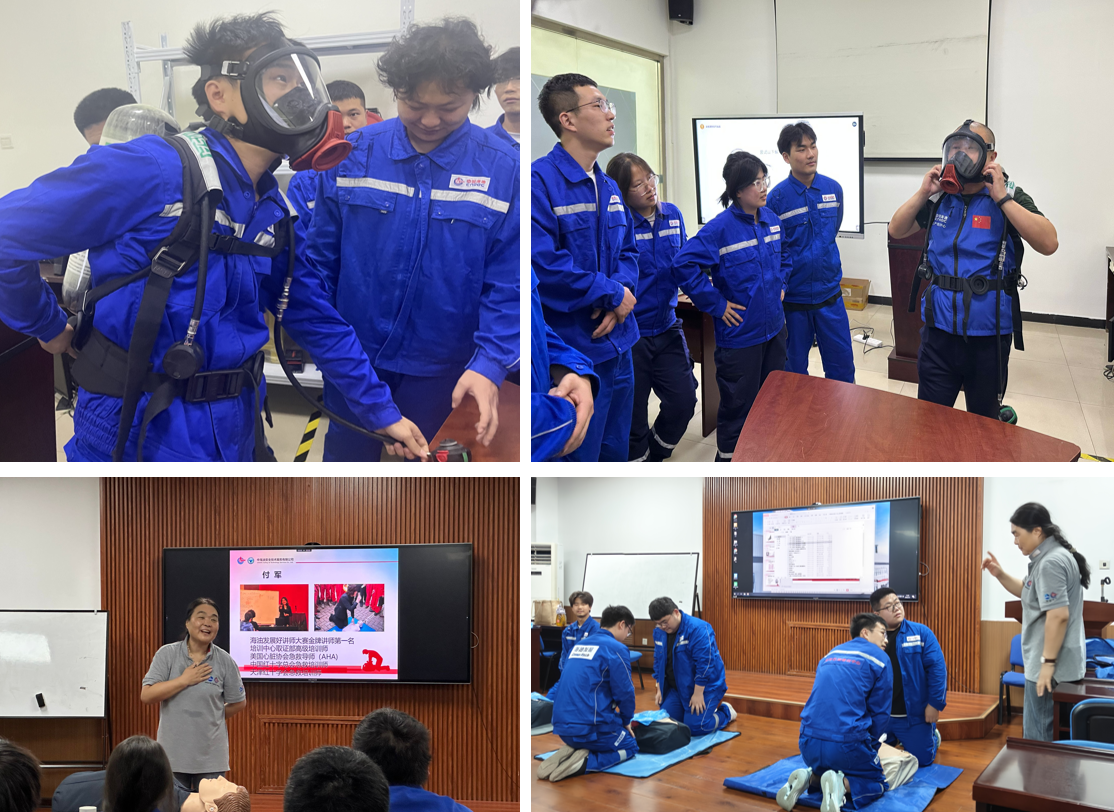 教学团队围绕“海上油田安全优先”,讲解安全用具使用与维护,演示正压式空气呼吸器等装备穿戴;结合案例引导学生多维度评估海上平台风险,树立“预防为先”理念。而后的应急技能培训则侧重实战,学生分组演练心肺复苏术(CPR)与自动体外除颤仪(AED)操作,并模拟烟热环境中的火灾逃生,强化应急自救能力。