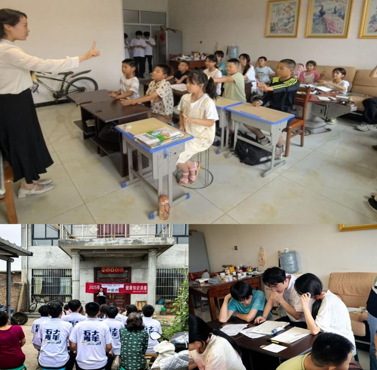 7月9日,团队联合村医在村医疗站旁广场开展医疗健康宣传活动,村医现场演示口罩佩戴、体温测量等技能,并发放消毒湿巾,守护儿童健康。
