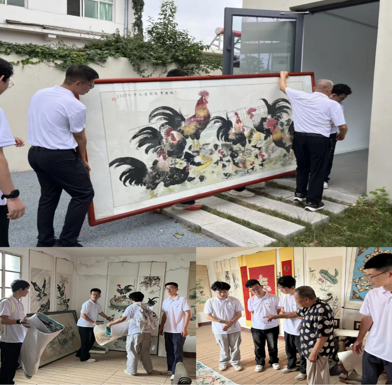 7月7日,实践团探访国家级非遗传承人段桂荣老人的画室,了解关中农民画的文化内涵与艺术价值。老人创作的《牡丹小鸡》等作品,以公鸡象征勤劳与希望,展现了深厚的乡土文化底蕴。实践团协助将老人耗时三月完成的巨型公鸡画移送至村传统文化纪念馆,助力非遗文化的保护与展示。队员们表示,将积极搭建桥梁,推动传统技艺在当代焕发新活力。