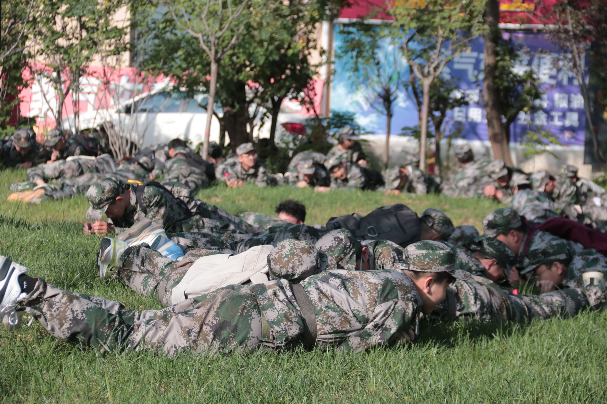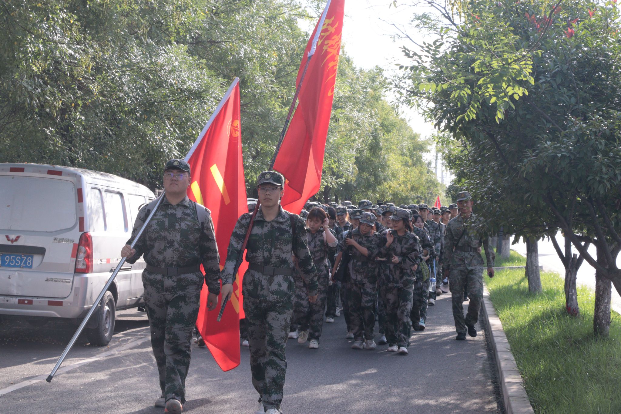 东门出、北门进,沿途设置4个调整点。各连队间隔保持20-30米,行军速度控制在3公里/小时。上午11:30,全体新生顺利返回东区操场。