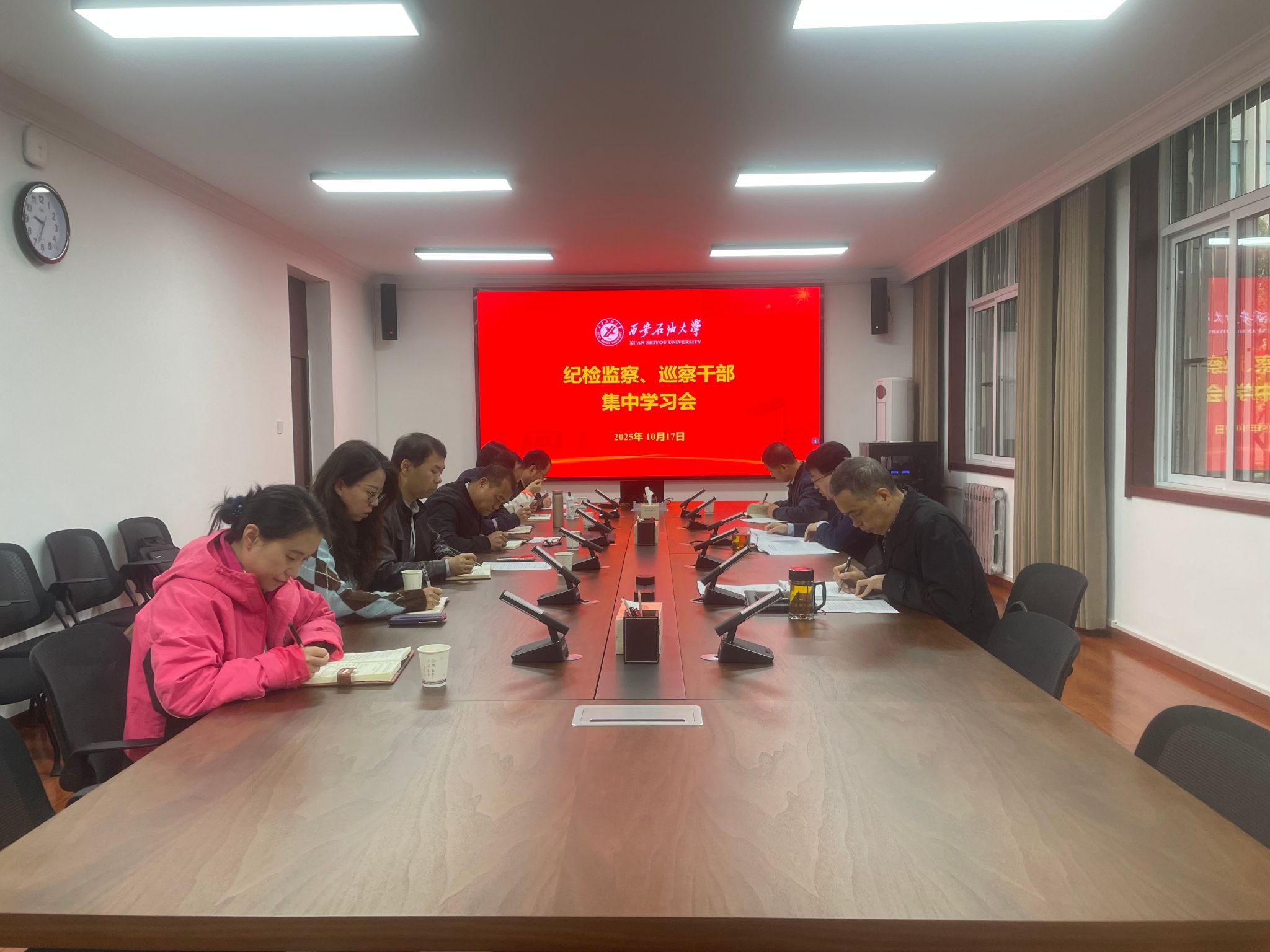 10月17日上午,纪检巡察干部2025年第18次集中学习会在鄠邑校区办公楼第四会议室召开。纪检监察机构、党委巡察工作办公室全体干部参加会议。会议由校党委副书记、纪委书记、监察专员王辉强主持。