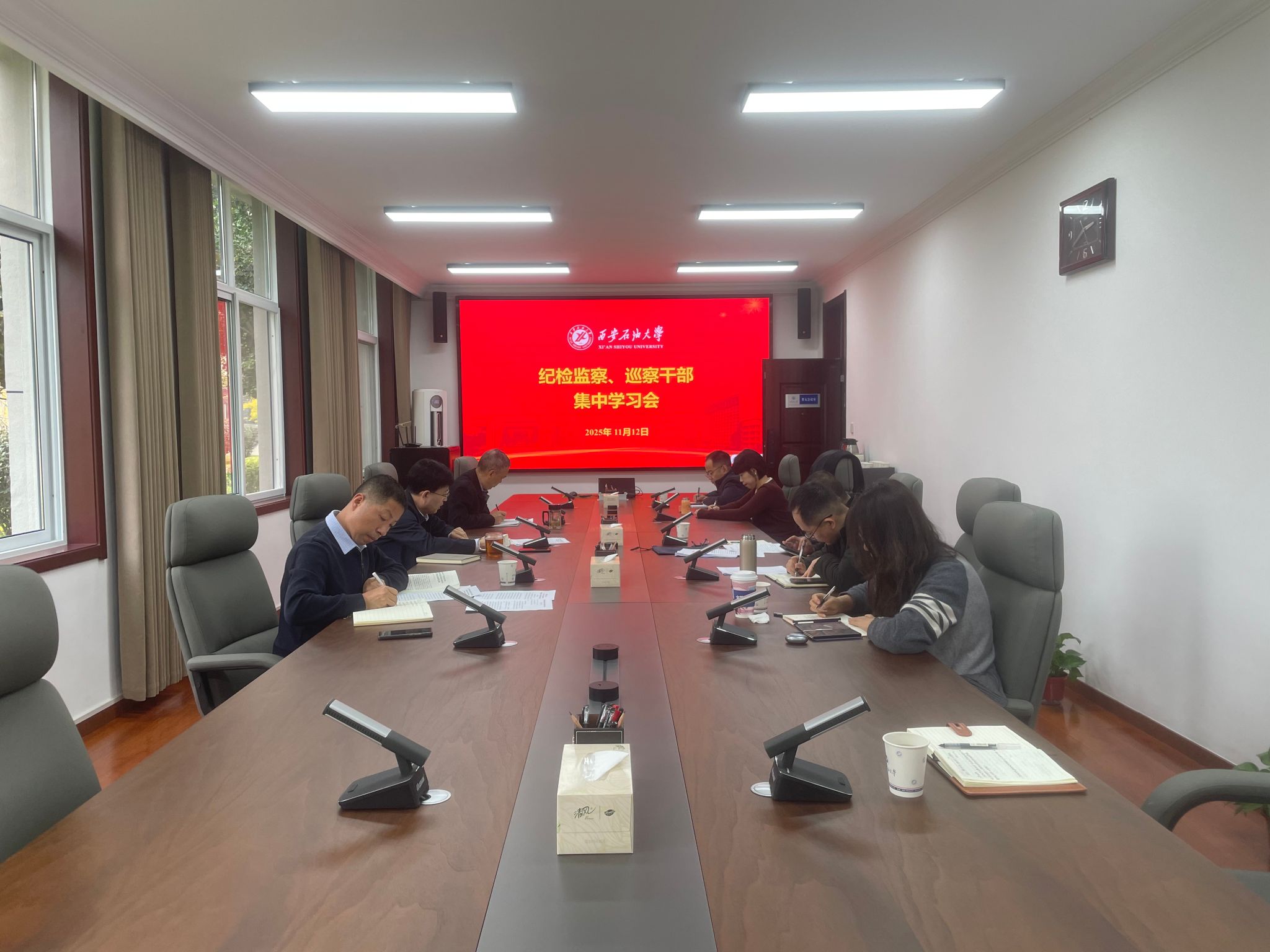 11月12日上午,纪检巡察干部2025年第21次集中学习会在鄠邑校区办公楼第五会议室召开。校党委副书记、纪委书记、监察专员王辉强主持学习会。纪检监察机构、党委巡察工作办公室全体干部参加会议。