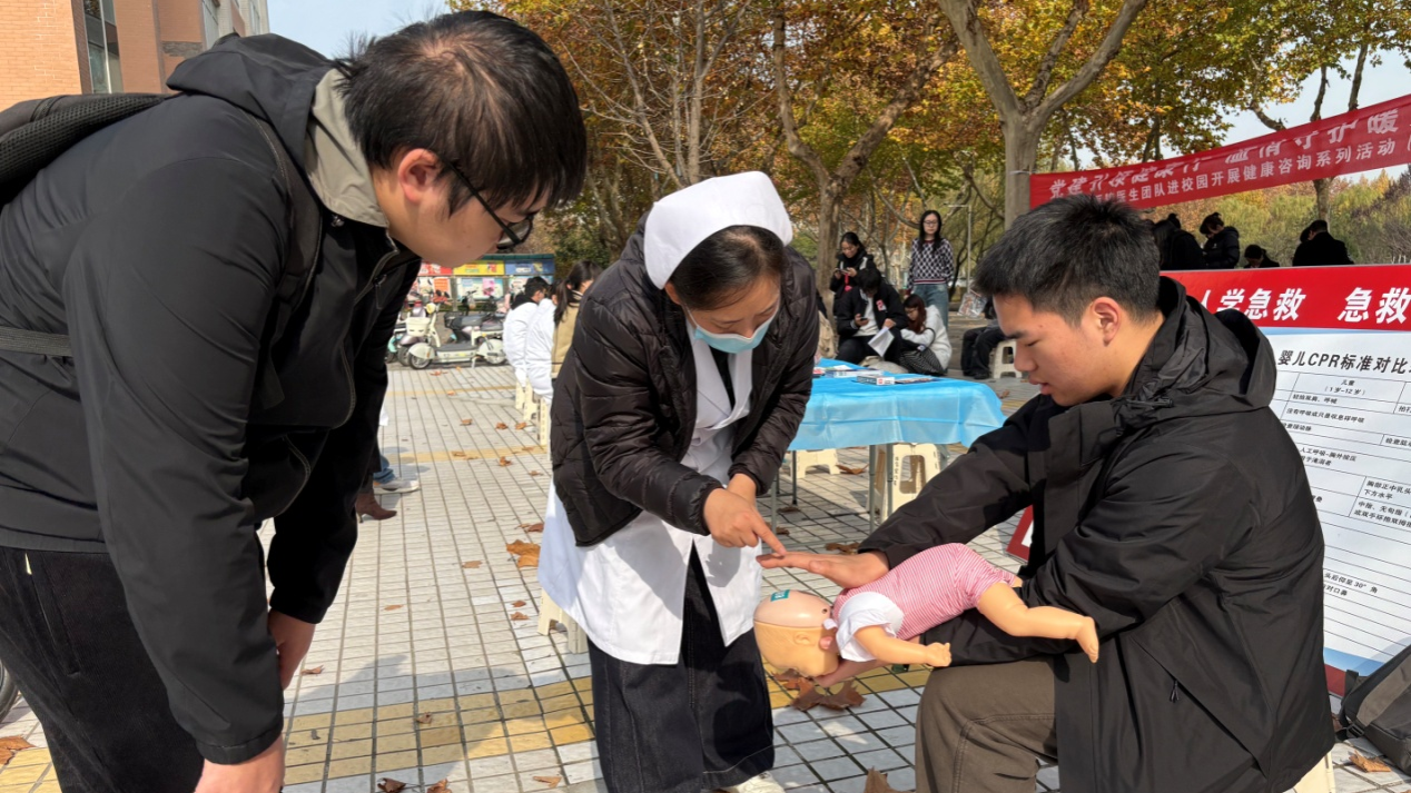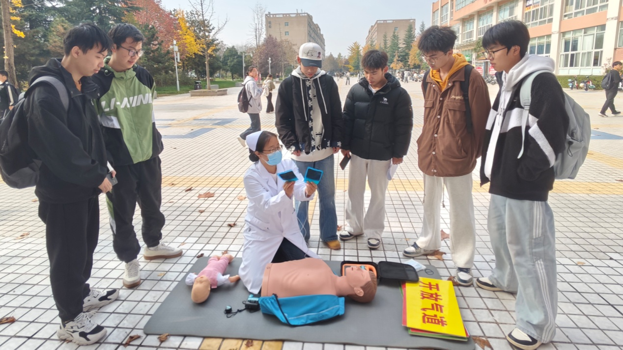 为提升校园应急救护能力,校医院护理部急救师资团队在两场活动中同步开展应急救护实操培训。借助模拟人教具,重点演示心肺复苏(CPR)、自动体外除颤仪(AED)操作及海姆立克急救法,将专业操作拆解为清晰步骤,采用“理论讲解+模拟实操”相结合的方式授课。