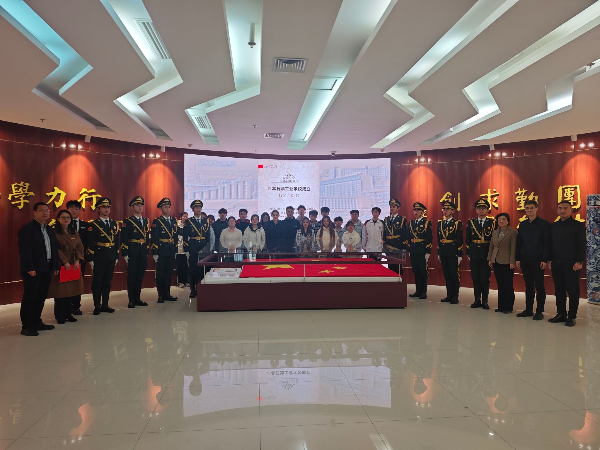 与共和国共同成长,同呼吸共命运。该面拥有特殊意义的国旗将时刻提醒着每一位西石大人牢记“兴油报国”使命,为校为国贡献自己的力量。