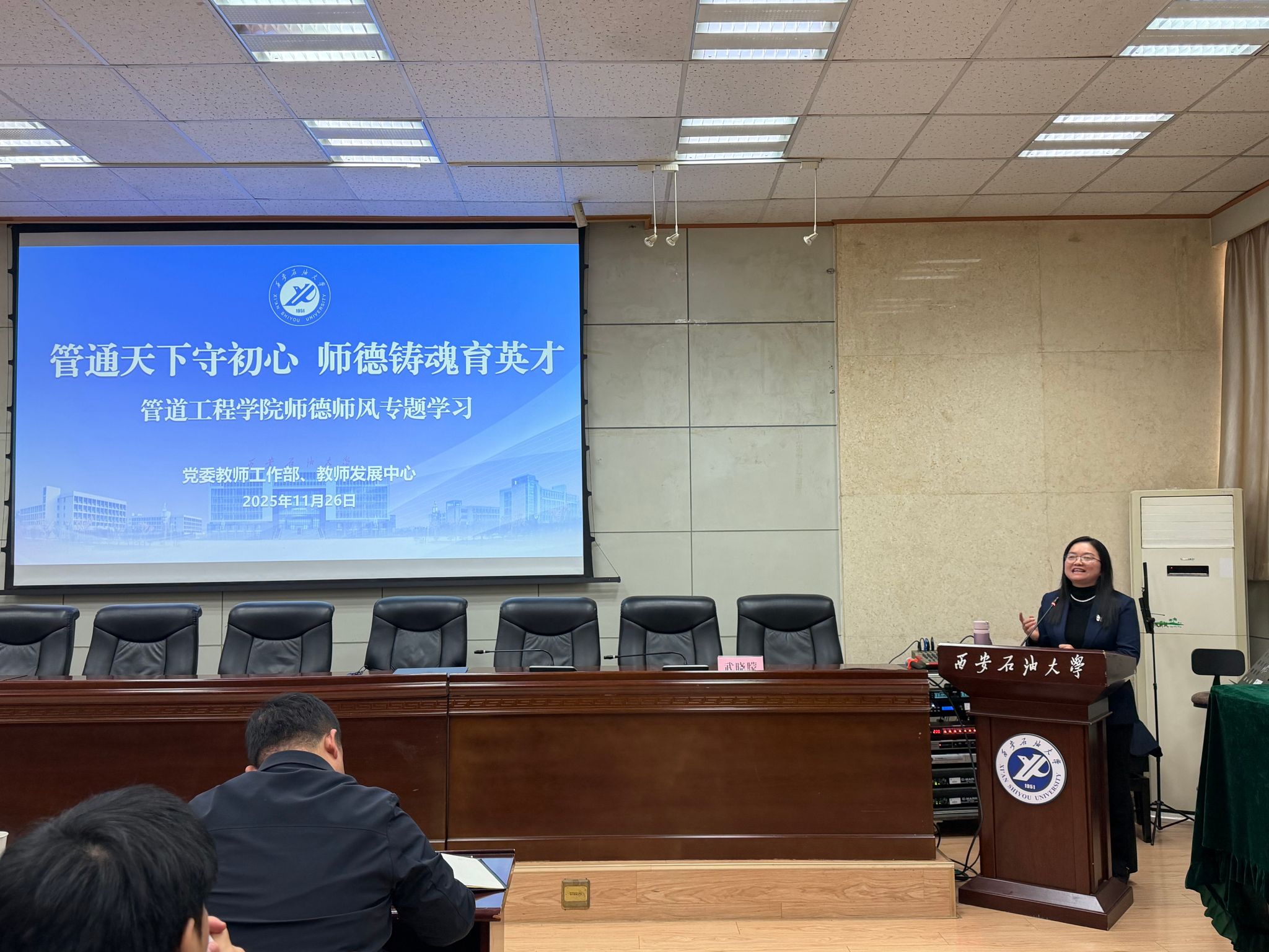 武晓朦围绕“师德师风的时代内涵”“教育家精神”“警示案例与底线思维”三个方面展开系统阐述。她指出,师德师风是评价教师队伍素质的第一标准,高校教师要把“传道”放在首位,以“四有”好老师为标准,以“大先生”为追求,把为学、为事、为人统一起来。学习中,通过剖析近年来教育部公开曝光的违反高校教师职业行为十项准则的典型案例,提醒广大教师以案为鉴、以案明纪,坚决守住政治方向、学术诚信、廉洁自律和关爱学生四条底线。