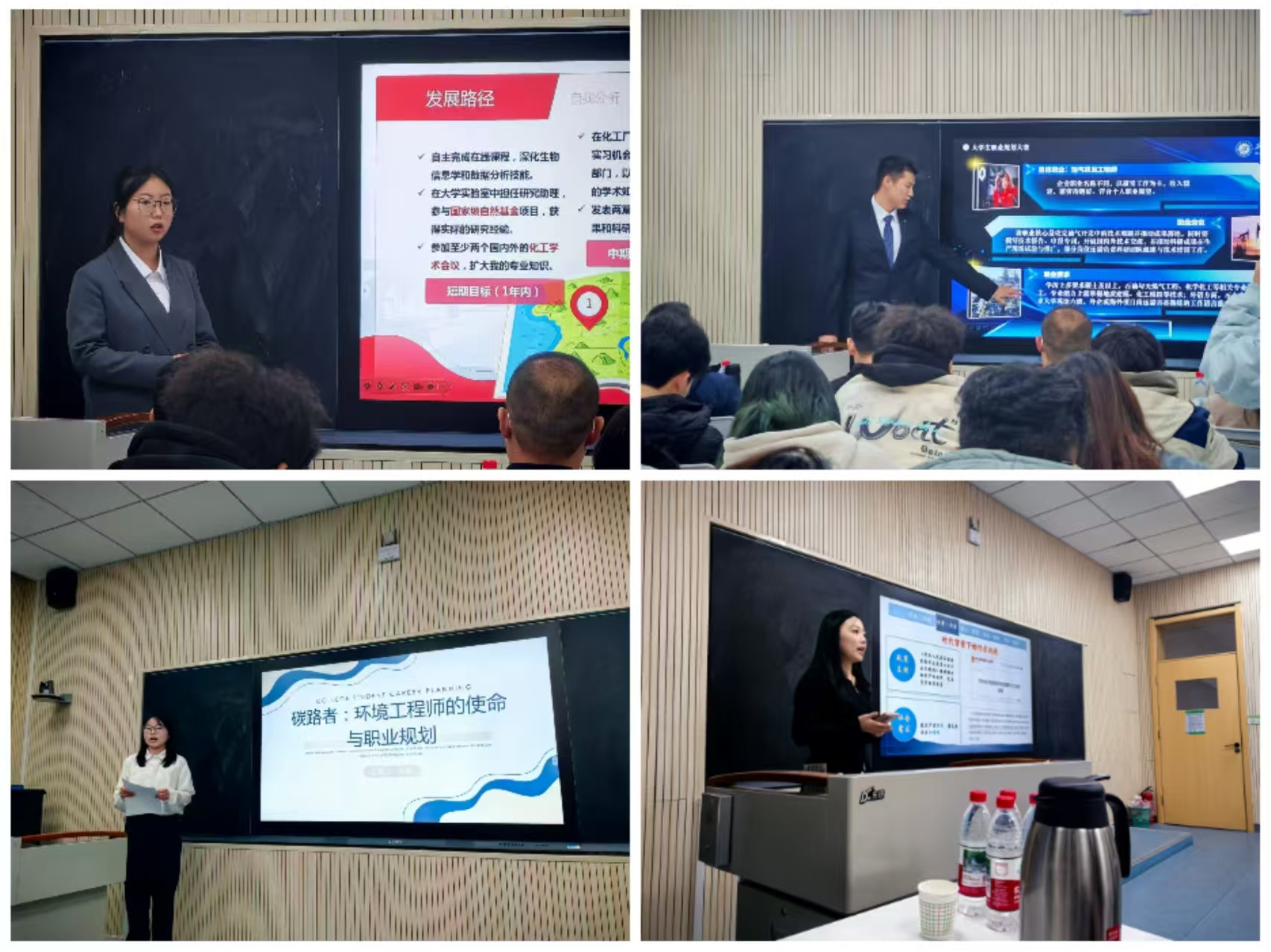 在石油领域的学科优势,对标中石油勘探开发研究院等标杆企业,用竞赛获奖经历与实验数据支撑能力提升计划,清晰规划了“本科筑基—考研深造—企业实战”的发展路径。2024级化学工程专业硕士安楠则聚焦通用化工工程师岗位,亮出“天正设计杯”全国化工设计竞赛三等奖等多项荣誉,以及参与国家级自然基金项目的科研经历,详细阐述了运用CAD、Aspen等专业工具提升核心竞争力的具体方案。2023级应用化学专业的丁焕另辟蹊径,将化学专业与知识产权服务结合,以“知识产权工程师”为方向,围绕专利挖掘与法规解读能力培养,提出“考取专利代理师资格证—参与专利撰写实践—深耕化工领域知识产权服务”的三阶计划。答辩中,面对“如何应对化工研发周期长的职业风险”“跨领域发展如何补足能力短板”等尖锐问题,选手们逻辑清晰、应答得体,展现出扎实的专业素养与前瞻的行业思维。台下观众全神贯注,当选手谈及将技术应用于油气高效开发、绿色化工等实践场景时,现场更是响起经久不息的掌声。
