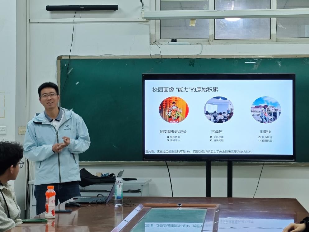 在交流环节,王楠结合自身阅历,向学弟学妹们提出了诸多真挚建议:树立健康的就业观,勇于拥抱新经济形态下的新兴职业;保持终身学习的热情,通过坚持运动与阅读来涵养心性、提升专业;学会“有效内卷”,聚焦于自身核心竞争力的锻造,并鼓励大家把握机遇,积极开启职业生涯。