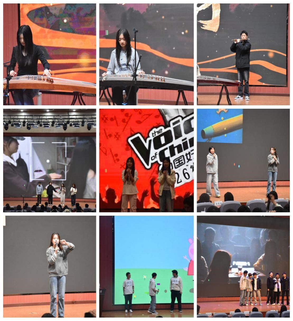表彰环节结束后,获奖宿舍分别展示了各自的丰硕成果。民乐合奏《象王行》先声夺人,氛围瞬间点燃;五个宿舍依次登台展示了各具特色的舍徽设计历程,从理念构思到视觉成型,每一处细节都凝聚着同学们的巧思与团队智慧;手抄报作品《雅室生辉》,通过图文并茂的形式,生动诠释了宿舍文化的内涵,彰显出深厚的情感寄托与人文意趣;宿舍成员合唱《一笑倾城》、《爱错》、《成都》,以歌声传递出室友间的温情与默契;宿舍主题演讲《屋檐下的星光》《致635的我们》,真挚表达了同学们对宿舍生活的深厚情感与美好期盼;舞台剧《宿舍好声音》、英语表演《Muddy Puddles》及微电影《629“甄嬛传”之旷课风波》,则凭借生动演绎与巧妙创意,将现场气氛推向高潮,笑声掌声不绝。