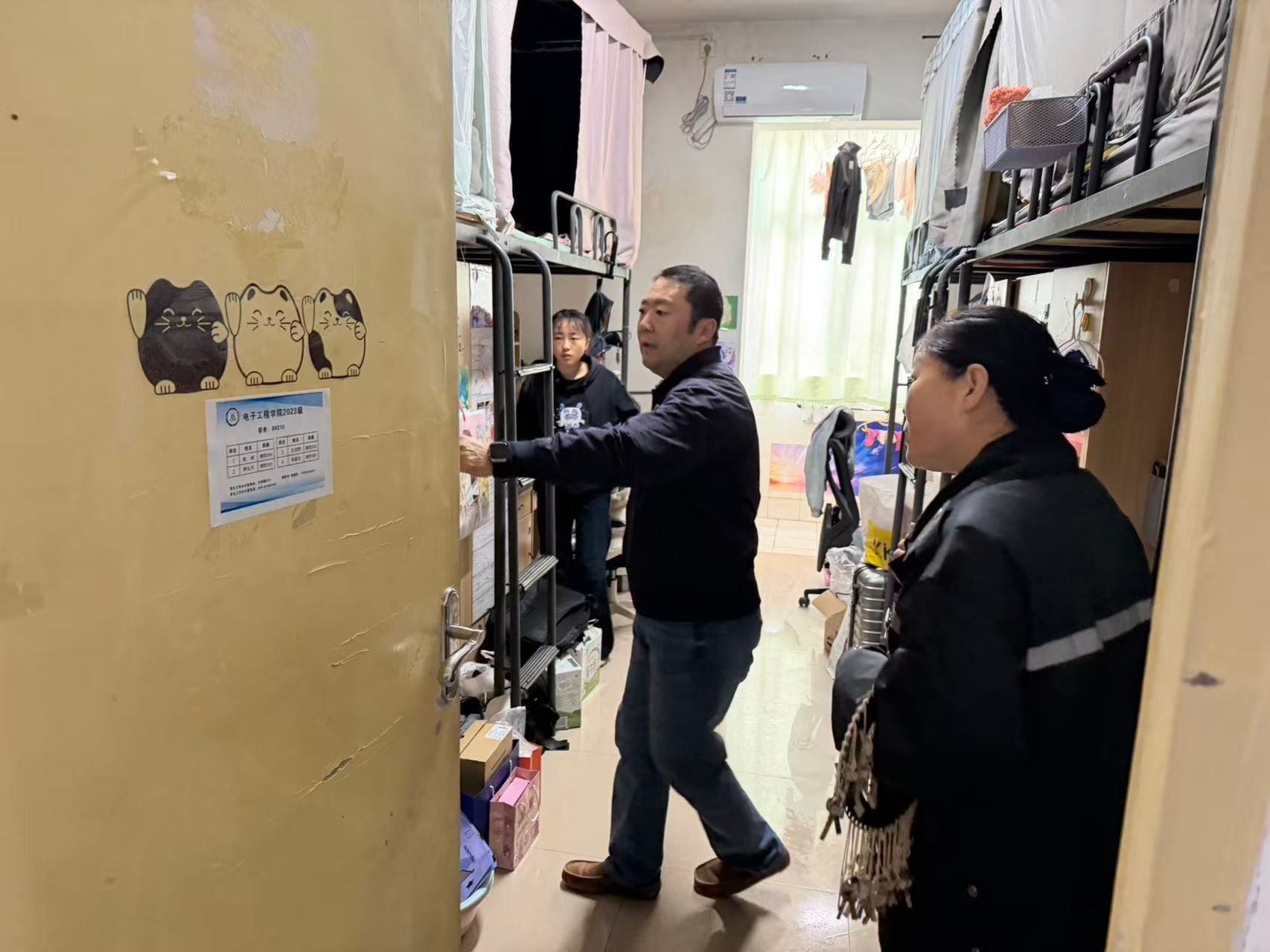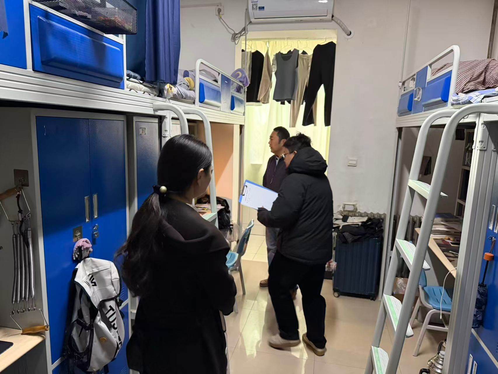 本次专项工作覆盖鄠邑校区全部20栋学生宿舍楼。检查组分为三个工作小组,重点围绕冬季用电安全、消防通道管理、违规电器使用等关键风险环节,对宿舍楼内安全设施、用电规范及内务管理情况进行了全面排查。