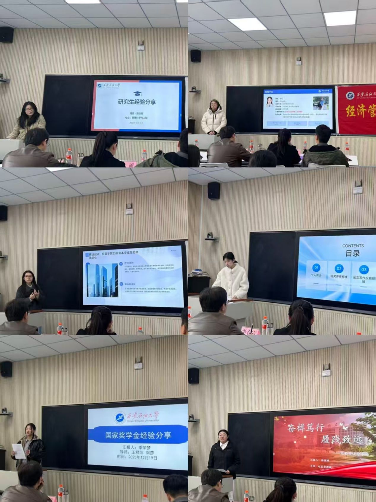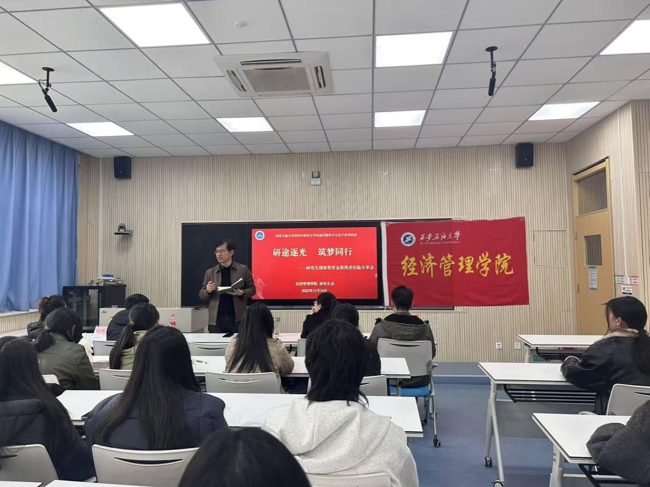 研究生学风建设暨学术文化月系列活动的号召。12月19日下午,经济管理学院研究生国家奖学金获得者经验分享会在鄠邑校区博览楼A115教室顺利举行。经济管理学院学院副院长李春霄,学生工作办公室副主任张硕,研究生辅导员及研究生代表参会。