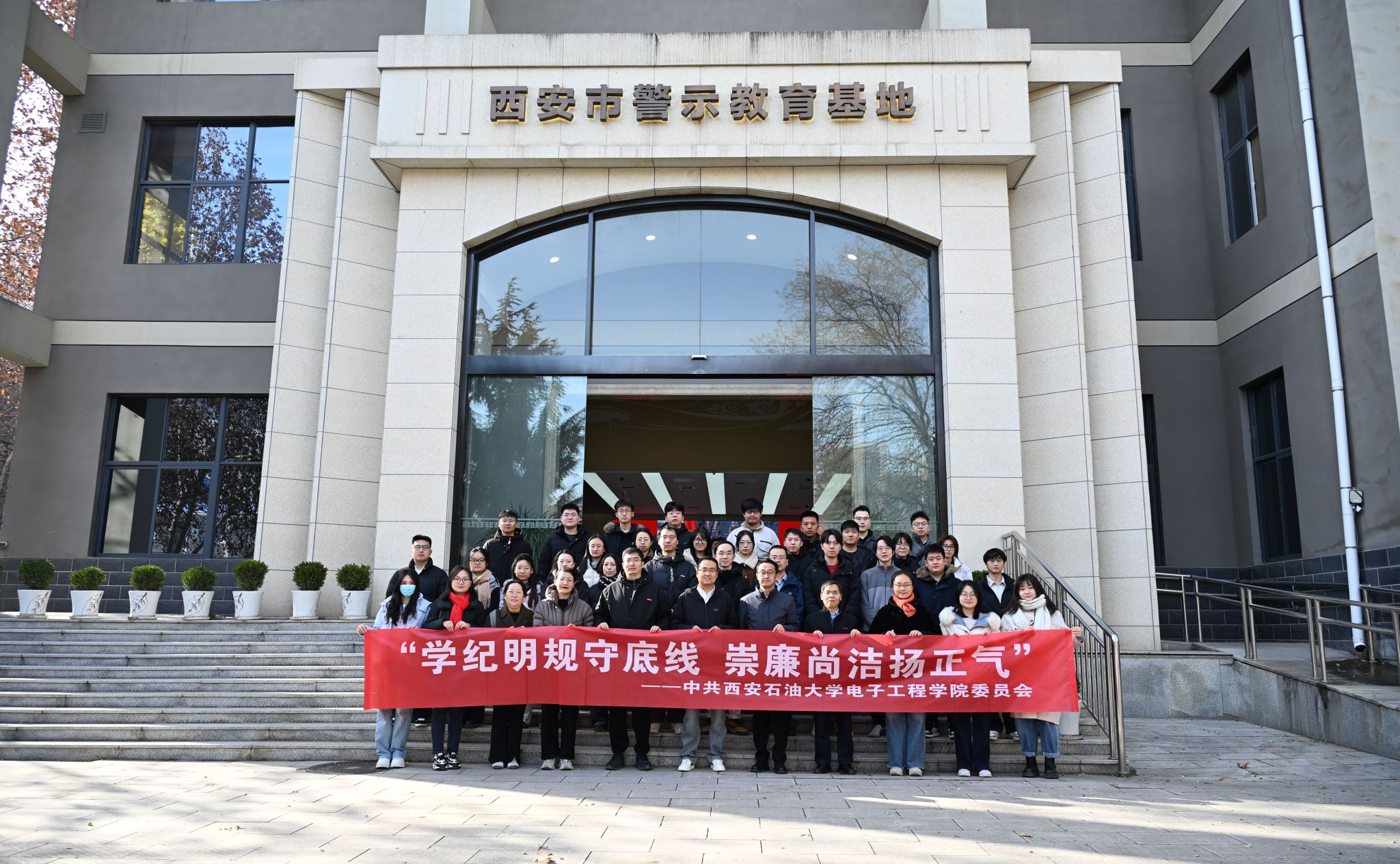 警示教育暨纪律教育学习宣传月活动安排,增强师生党员的纪律意识、规矩意识和廉洁自律意识,电子工程学院党委紧扣“学纪明规守底线,崇廉尚洁扬正气”主题,于12月24日下午组织师生党员代表前往西安市警示教育基地,开展了一场严肃深刻的现场警示教育活动。学院领导班子成员、教工党支部支部委员、近三年新入职教师以及研究生党员代表等共计40人参加了此次活动,活动由学院党委副书记、纪检委员芮执根带队。