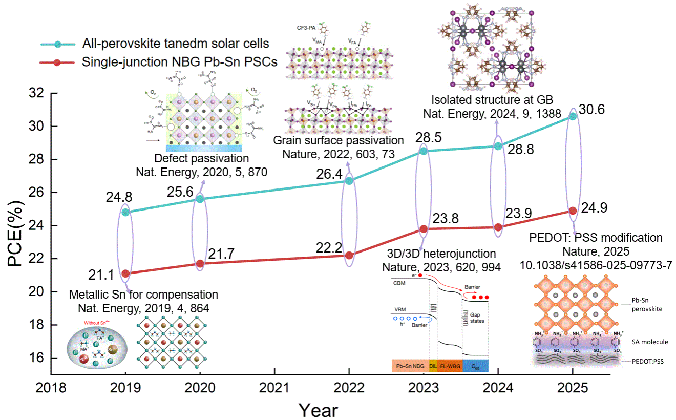 金属卤化物钙钛矿太阳能电池在过去十年中取得了显著进展,但其单结器件的效率受限于肖克利-奎伊瑟理论极限。为突破这一瓶颈,构建叠层太阳能电池成为最有效途径。全钙钛矿叠层电池因其低成本、高效率和柔性兼容性备受关注,其中窄带隙铅-锡混合钙钛矿子电池负责吸收红外光子,其性能直接决定叠层器件的整体表现。然而,Sn²⁺易氧化、结晶过程难以控制、薄膜缺陷密度高以及界面能级不匹配等问题,导致严重的非辐射复合损失、载流子扩散长度不足和提取效率低下,制约了单结铅-锡电池达到约32%的理论效率极限,也阻碍了叠层电池向约46%的理论效率迈进。近年来,界面工程策略在抑制缺陷、优化能级排列和提升稳定性方面展现出巨大潜力,推动单结铅-锡电池效率超过24%,叠层电池效率突破30%。因此,系统总结当前铅-锡钙钛矿界面工程的进展,建立研究范式,对实现高性能叠层器件的可持续发展具有重要意义。