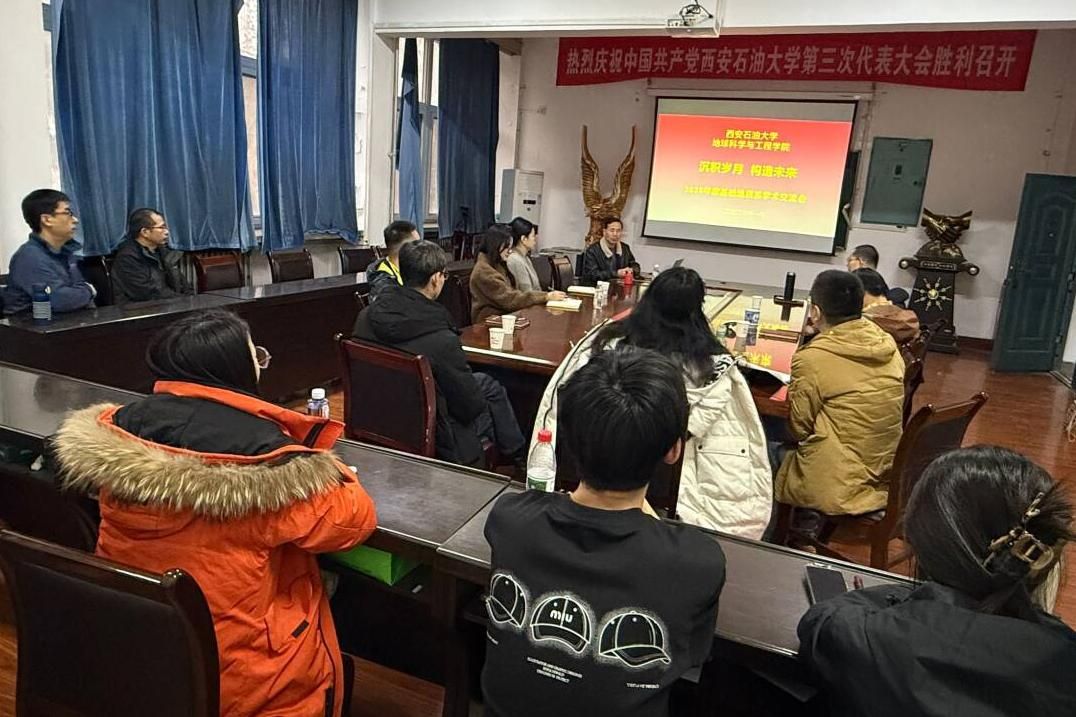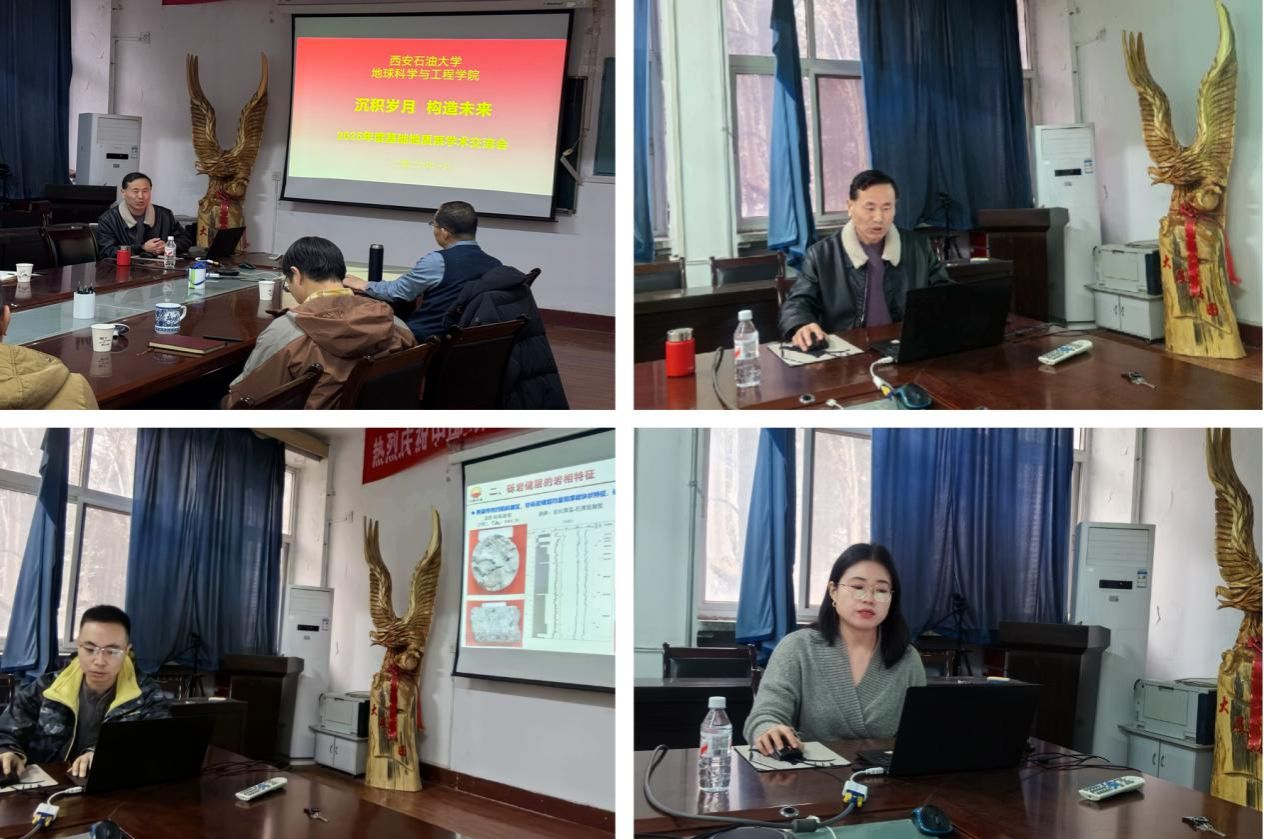 学科建设规划,推动科研组织模式创新,加强地质学专业建设发展,地球科学与工程学院充分发挥统筹引领作用,积极推动系所协同与资源共享,1月14日上午,由基础地质系承办、学院沉积学与古地理研究所、盆地构造研究所、矿物岩石地化与储层地质研究所、古生物与古生态研究所共同协办的“沉积岁月、构造未来”暨2025年度学术交流会,在雁塔校区1号实验楼206会议室成功举办。此次活动是学院层面系统布局、系所深度融合联动的一次重要实践,旨在夯实科研基础、促进交叉融合、凝聚研究合力。基础地质系主任李元昊参加会议并致辞,副主任陈志鹏、丁超,各研究所负责人及系所教师、研究生共30余人参会。