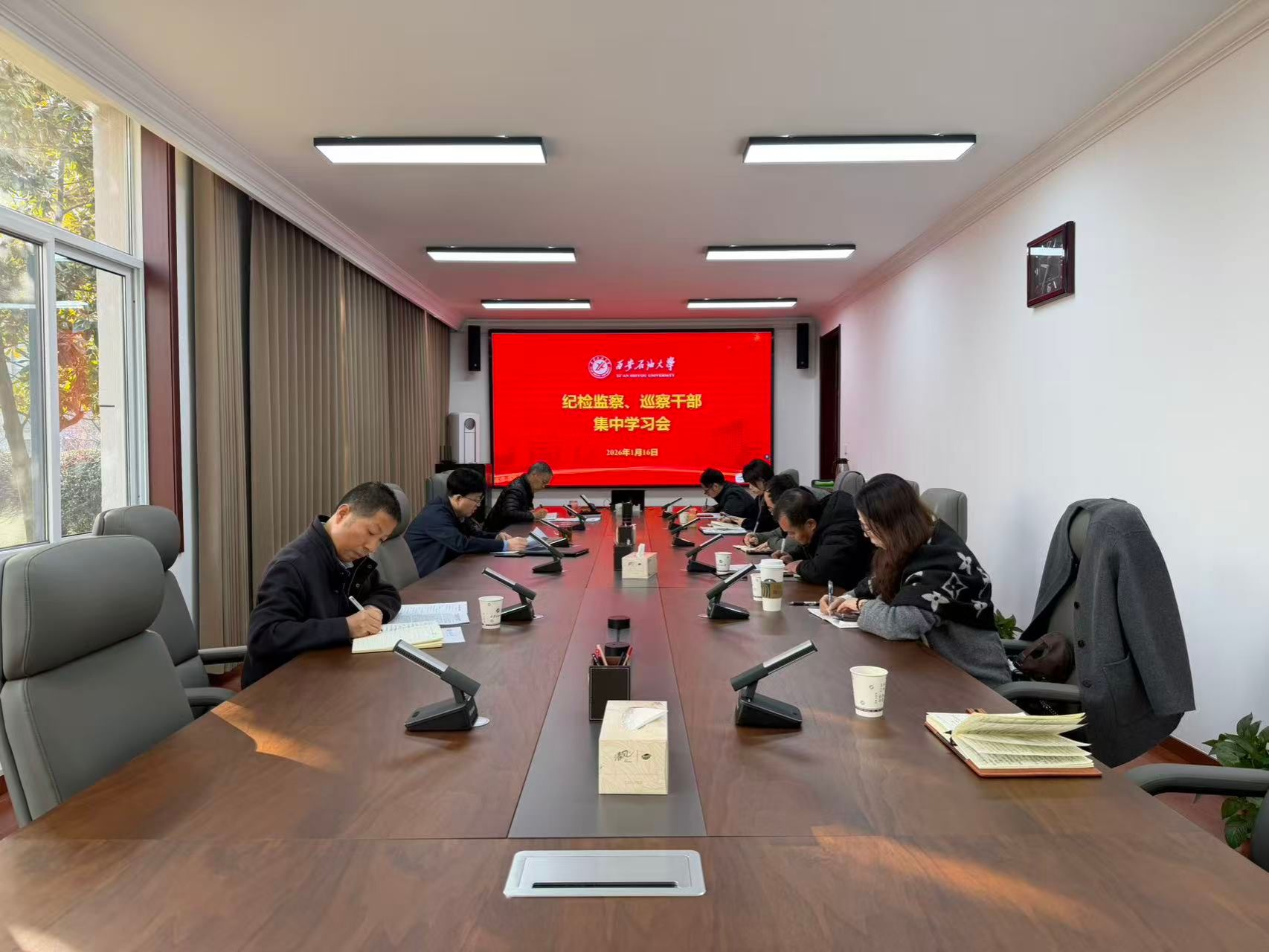 1月16日上午,纪检巡察干部2026年第1次集中学习会在鄠邑校区办公楼第五会议室召开。校党委副书记、纪委书记、监察专员王辉强主持学习会。纪检监察机构、党委巡察工作办公室全体干部参加会议。