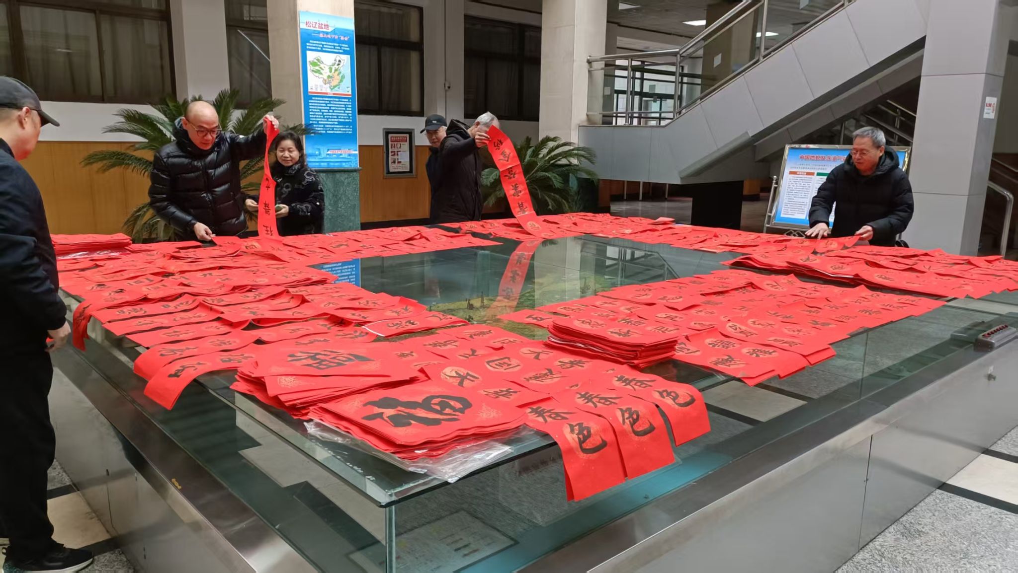 春潮涌动处,笔墨送福来。2026年1月23日,老年书画协会组织开展的新春义写春联活动在现场热闹启幕,活动从上午九点持续至下午一点,历时四小时圆满落幕。本次活动筹备充分、参与热烈,共创作近400幅春联与600余幅福字,所有作品在活动期间师生群众争相领取一空,用笔墨书香为即将到来的马年新春增添了浓厚的节日氛围。